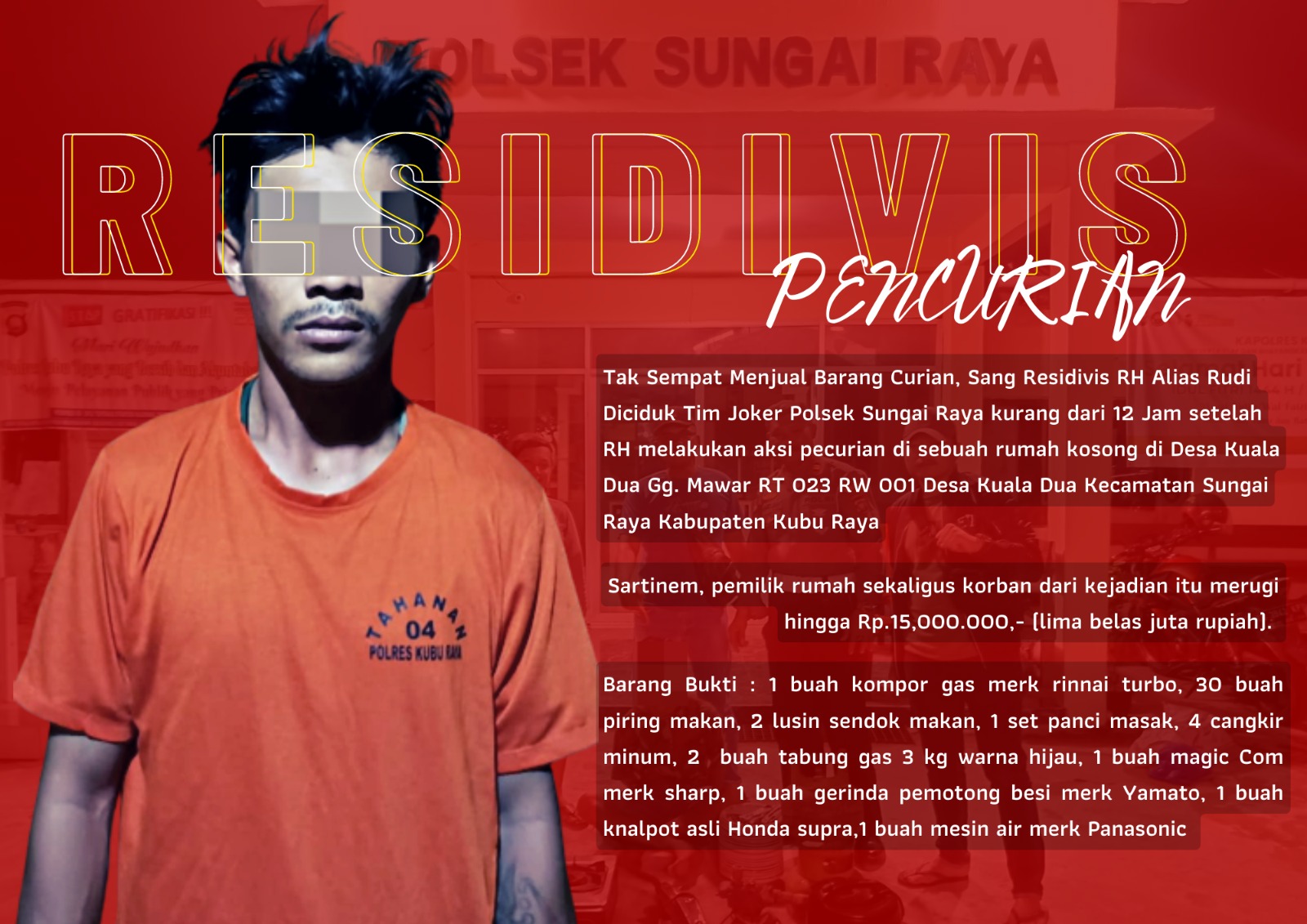 Kapolres Kubu Raya, AKBP Arief Hidayat, S.H.,S.I.K melalui Kapolsek Sungai Raya, AKP Saragih Hasiholan, S.H., membenarkan penangkapan seorang pria berumur 29 tahun seorang Residivis Kasus Pencurian berinisial RH Alias Rudi warga Kuala Dua yang berprofesi sebagai buruh bangunan.