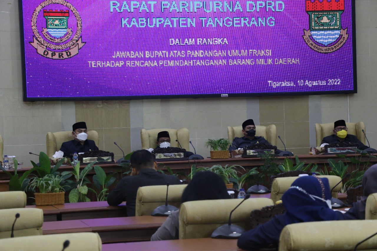Dalam sambutannya, H. Mad Romli mengucapkan terima kasih kepada Pimpinan dan Anggota DPRD yang telah menyampaikan tanggapan, pertanyaan dan pernyataan fraksi-fraksi atas Rencana Pemerintah Daerah untuk melakukan pemindahtanganan Barang Milik Daerah Kabupaten Tangerang melalui penjualan dan hibah.