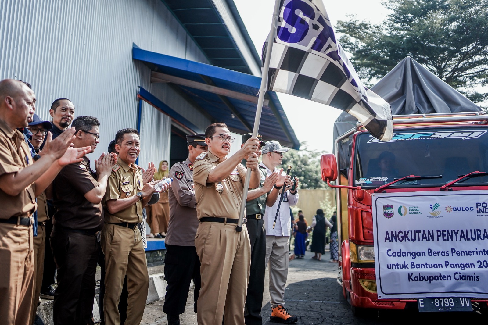 CIAMIS*,- Pj Bupati Ciamis, Engkus Sutisna resmi melepas Penyaluran cadangan beras pemerintah untuk bantuan pangan 2024 Kabupaten Ciamis tahap dua alokasi April bertempat di Komplek Pergudangan BULOG Pamalayan, Selasa (14/05/2024).