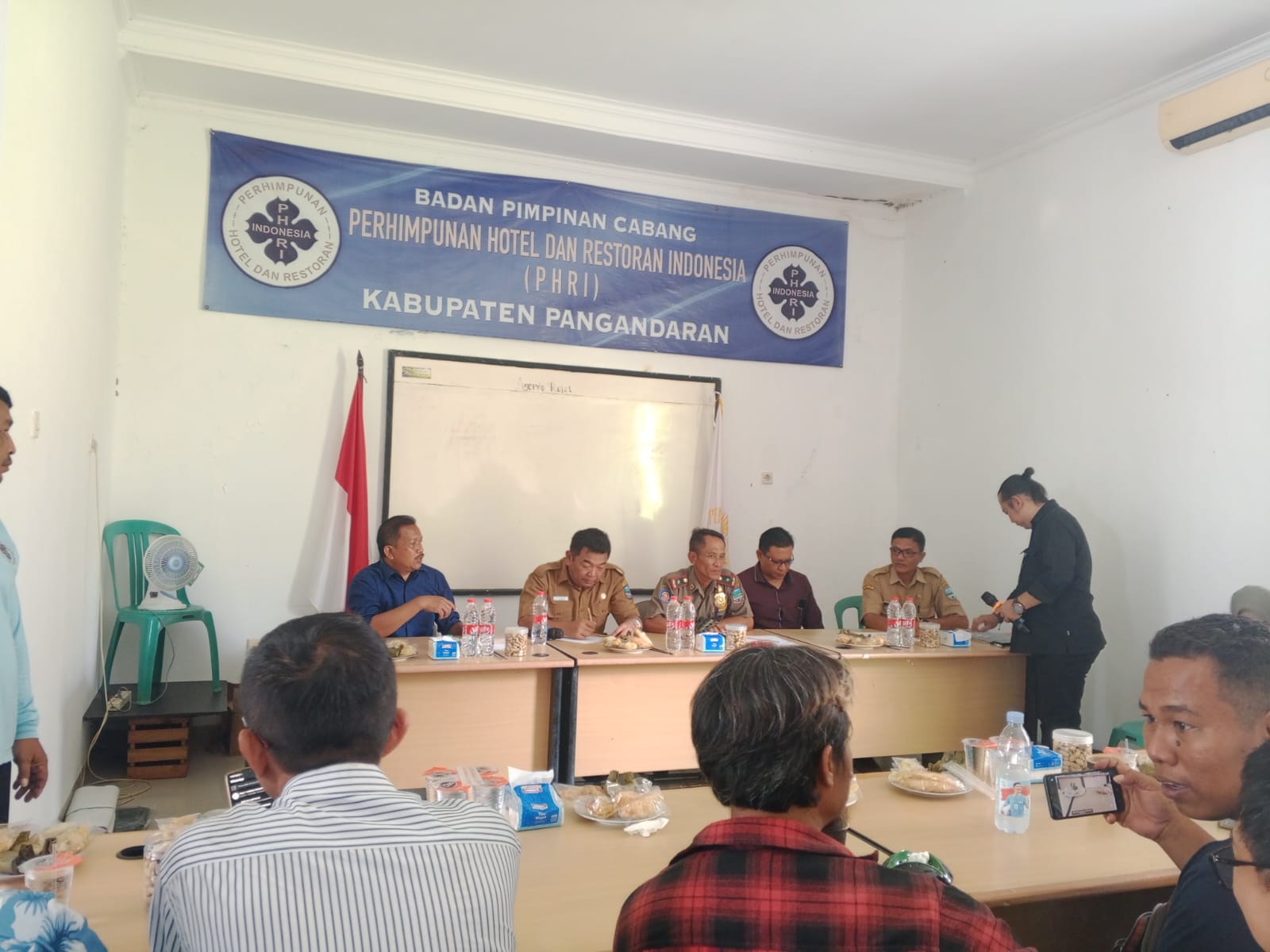 Kegiatan tersebut dihadiri oleh berbagai pemangku kepentingan, di antaranya *Agus Mulyana selaku Ketua PHRI Pangandaran, Irwansyah Kepala DLHK Pangandaran, perwakilan IHGMA Aby*, Dadan Sutisna daripada Disparbud, Kasatpol PP Bangi, serta masyarakat pelaku wisata dan para pedagang di kawasan Pantai Pangandaran.