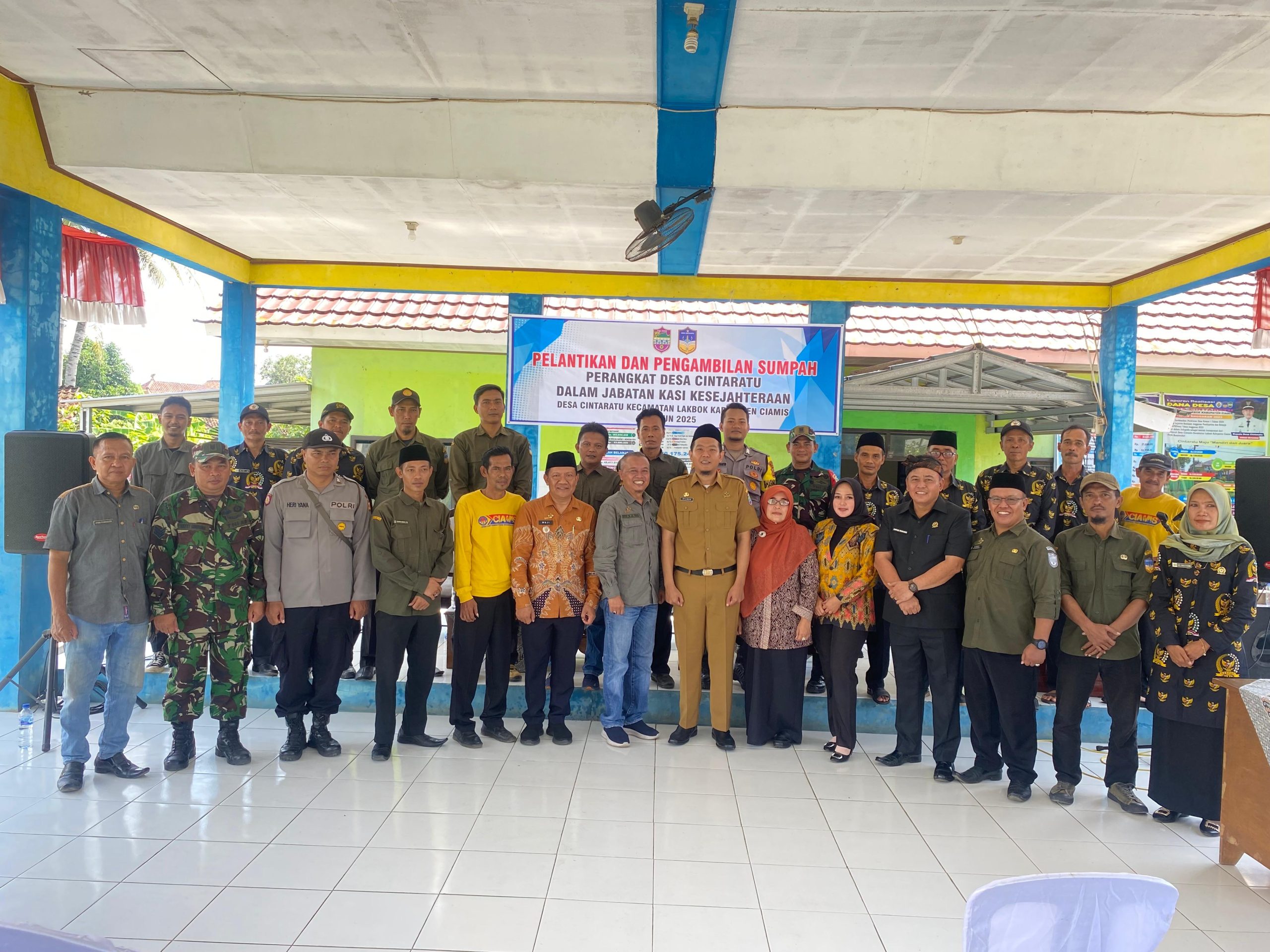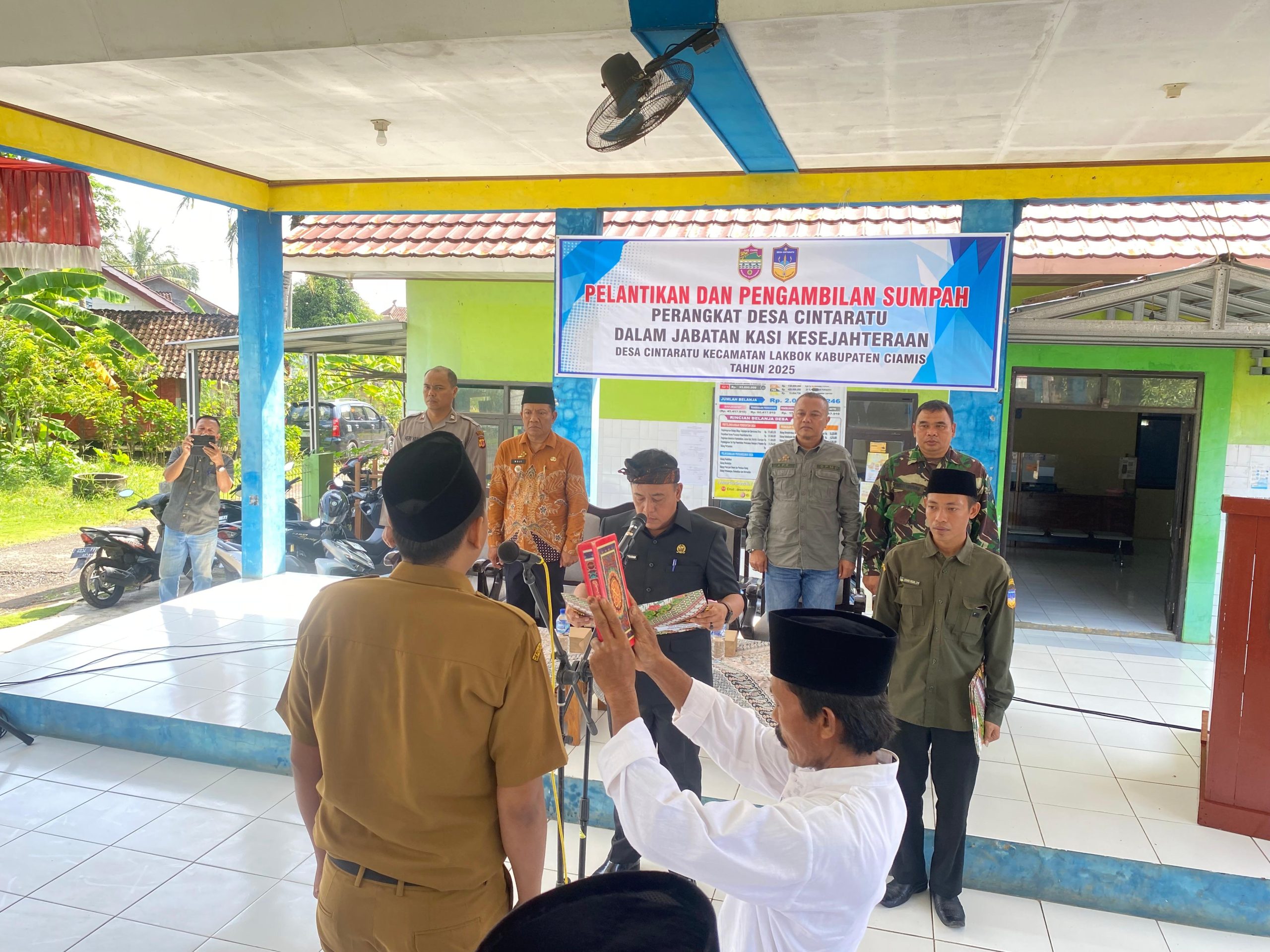 Pelantikan Dan Pengambilan Sumpah Kasi Kesra tersebut Dipimpin Langsung Oleh Kepala Desa Cintaratu Kec. Lakbok , Ahmad Musadad,Pelantikan dan Pengambilan Sumpah di hadiri dan disaksikan Langsung Oleh Kepala Dinas Pemberdayaan Masyarakat Desa ( DPMD ) Kabupaten Ciamis. H Ape Ruswandana. SP , Camat Lakbok, Mujiono, S.T.MS.i bersama Perwakilan Kapolsek Dan Perwakilan Danramil Lakbok dan juga di Ikuti Oleh para Perangkat Desa Cintaratu.BPD, Ketua LPM, Ketua TP PKK, Perwakilan Kader PKK dari tiap Dusun, Perwakilan Karang Taruna, Ketua MUI Desa, Ketua RW, Ketua RT, Rohaniawan, Bhabinkamtibmas, Babinsa Dan Para Tokoh masyarakat Desa Cintaratu.