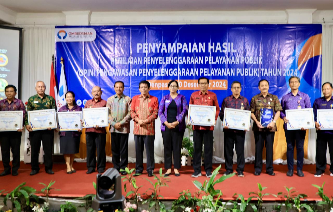 DENPASAR* – Di penghujung tahun 2024, Pemerintah Provinsi Bali kembali menorehkan prestasi sebagai provinsi dengan predikat Kepatuhan Penyelenggaraan Pelayanan Publik Kualitas Tertinggi dengan nilai 96,94, kategori A (zona hijau), dari Ombudsman RI. Penghargaan diserahkan langsung oleh Pimpinan Ombudsman RI, Jemsly Hutabarat, kepada Pj. Gubernur Bali yang diwakili oleh Sekretaris Daerah Provinsi Bali, Dewa Made Indra, dalam acara Penyampaian Hasil Penilaian Penyelenggaraan Pelayanan Publik di Inna Bali Heritage, Jalan Veteran, Denpasar, Selasa (10/12).