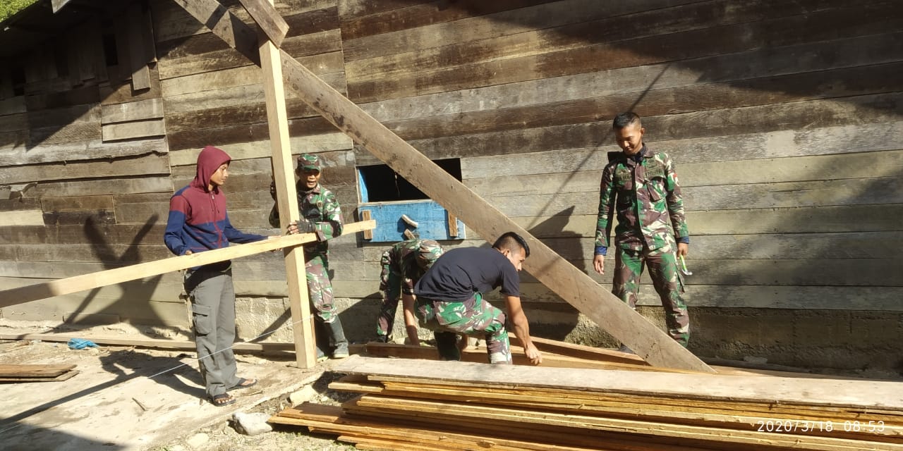 Para personil Satgas berbaur jadi satu dengan warga desa setempat untuk terus bekerja di sejumlah sasaran fisik yang telah diprogramkan di TMMD Reguler Ke 107 ini.(Amin lingga)