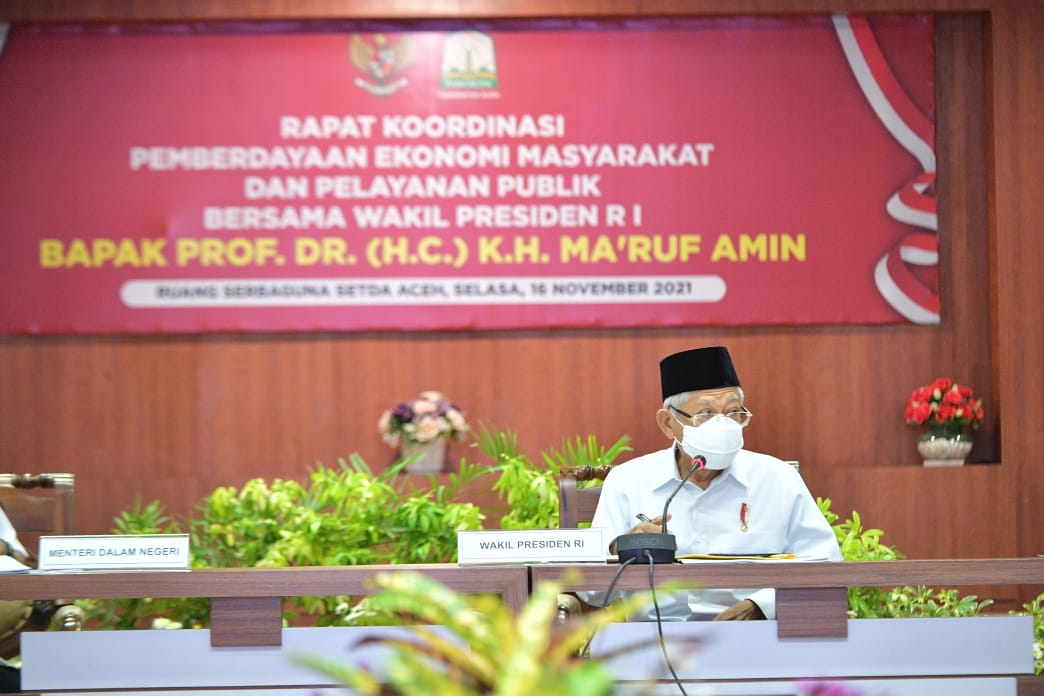 Berita Wapres RI – Mengawali aktivitas dalam kunjungan kerjanya di Provinsi Aceh, Wakil Presiden (Wapres) K.H. Ma’ruf Amin langsung memimpin Rapat Koordinasi mengenai Pemberdayaan Ekonomi Masyarakat dan Pelayanan Publik di Kantor Gubernur Aceh, Jl. Teuku Nyak Arief No. 219 Banda Aceh, Selasa pagi (16/11/2021).