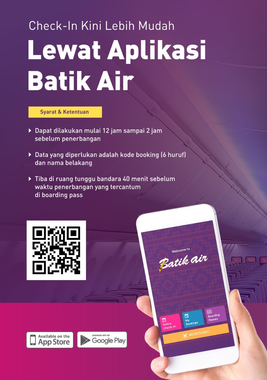 Download “Batik Air Mobile Apps” sekarang. Aplikasi ini dapat digunakan pada platform OS Android pada Google Play Store dan iOS melalui aplikasi Apple Store.