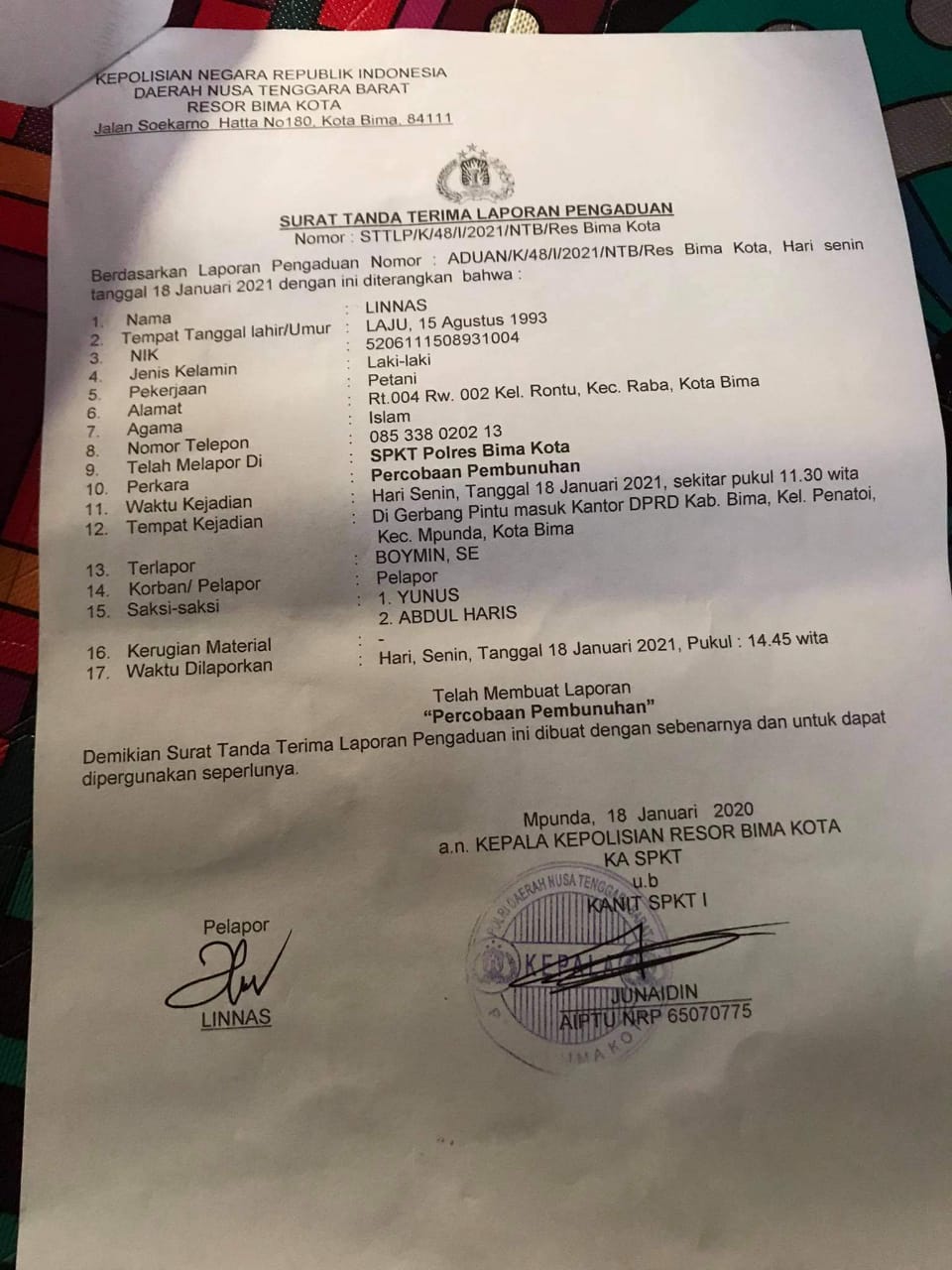 Sekjen LesHam Linmas ketika di konfirmasi mengatakan,”dugaan percobaan pembunuhan oleh oknum anggota DPRD Kab.Bima dari Fraksi Gerinda berinisial BM ketika dirinya beserta rekan-rekan melakukan aksi demo di depan gedung DPRD Senin 18 Januari 2021 terkait dugaan kasus korupsi dana PKBM Karoko Mas pemiliknya salah satu anggota DPRD Kab,.Bima saat saya lagi di wawancarai oleh salah satu media Inews TV,tiba-tiba dari arah belakang datang mobil dengan kecepatan kencang mengarah ke arah mencoba menabrak diri saya,pengemudi mobil tersebut adalah oknum anggota DPRD Kab.Bima dari Fraksi Gerinda berinial BM , untung dengan cepat saya menghindar sehingga kecelakaan tidak terjadi,”ujar linnas