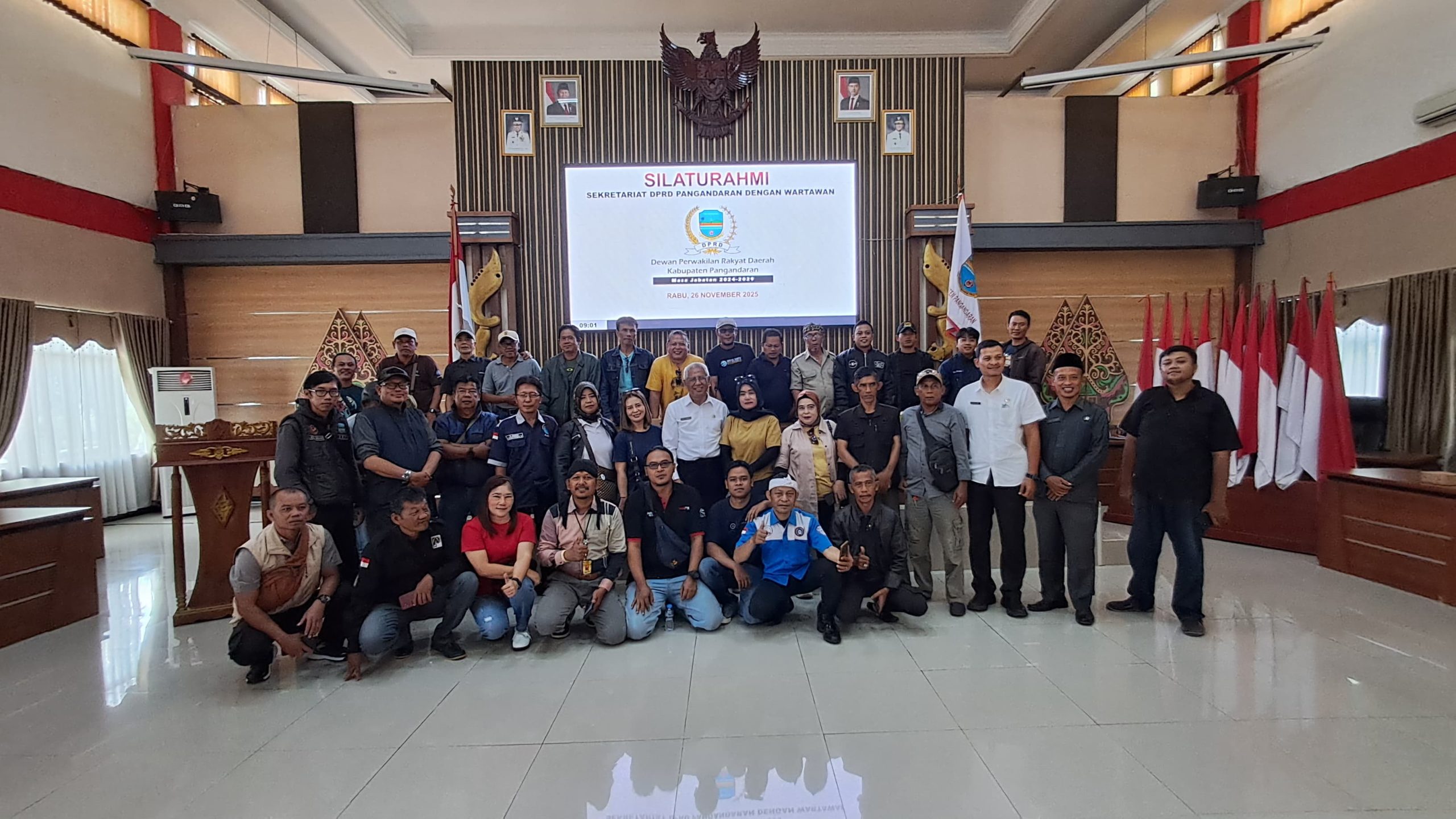 Layar utama ruangan menampilkan tema kegiatan “Silaturahmi Sekretariat DPRD Pangandaran dengan Wartawan”. Suasana diskusi tampak hangat, namun tetap dalam nuansa formal mengingat posisi DPRD sebagai lembaga penyelenggara pemerintahan daerah.