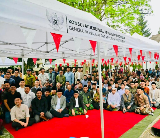 Baraknews Frankfurt, Jerman – Pengurus Cabang Istimewa (PCI) Nahdlatul Ulama Jerman menggelar halalbihalal peringatan 1 Abad Nahdlatul Ulama pada Sabtu (06/05) dimulai pukul 12.00 hingga 17.00 waktu setempat. Bertempat di Wisma Indonesia Konsulat Jenderal Repulik Indonesia (KJRI) Frankfurt, acara dibuka oleh Konjen RI di Frankfurt Acep Somantri, dihadiri oleh Konjen RI di Hamburg Ardian Wicaksana serta perwakilan dari KBRI di Berlin yaitu Kombes Pol. Shinto Silitonga dan Ahmad Rakhmadi. Juga hadir dalam acara tersebut yaitu Rois Syuriah NU Jerman KH. Saeful Fatah, Ketua Tanfidziyah Gus Oding, Ketua ICMI Eropa Raya Prof. Hendro Wicaksana dan beberapa pimpinan dan anggota ormas Islam di Jerman lainnya seperti PCI Muhammadiyah Jerman, Masyarakat Muslim Indonesia, GUSDURian Jerman dan tokoh NU lainnya.