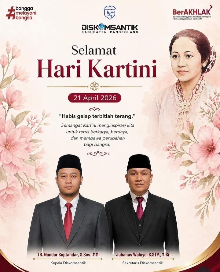 Diskomsantik Kabupaten Pandeglang Mengucapkan Selamat HARI KARTINI 2026admin21 April 2026Berita Kabupaten Pandeglang25 Dilihat No ratings yet. Nilai Kualitas Konten Berikan Rating Post Views: 25 Jangan LewatkanBupati Lantik 94 Pejabat Administrator19 Kopdes di Pandeglang Terima Bantuan Truk OperasionalBupati Dewi Lepas Atlet BMX Freestyle Yang Akan Berlaga Dinegeri JiranBupati Dewi Sebut Istighotsah Salah Satu Ikhtiar untuk Kemajuan PandeglangPimpinan DPRD Kab.Pandeglang Mengucapkan Hari Jadi Kab.Pandeglang Ke-152Diskomsantik Kab.Pandeglang Mengucapkan Hari Jadi Kab.Pandeglang Ke-152