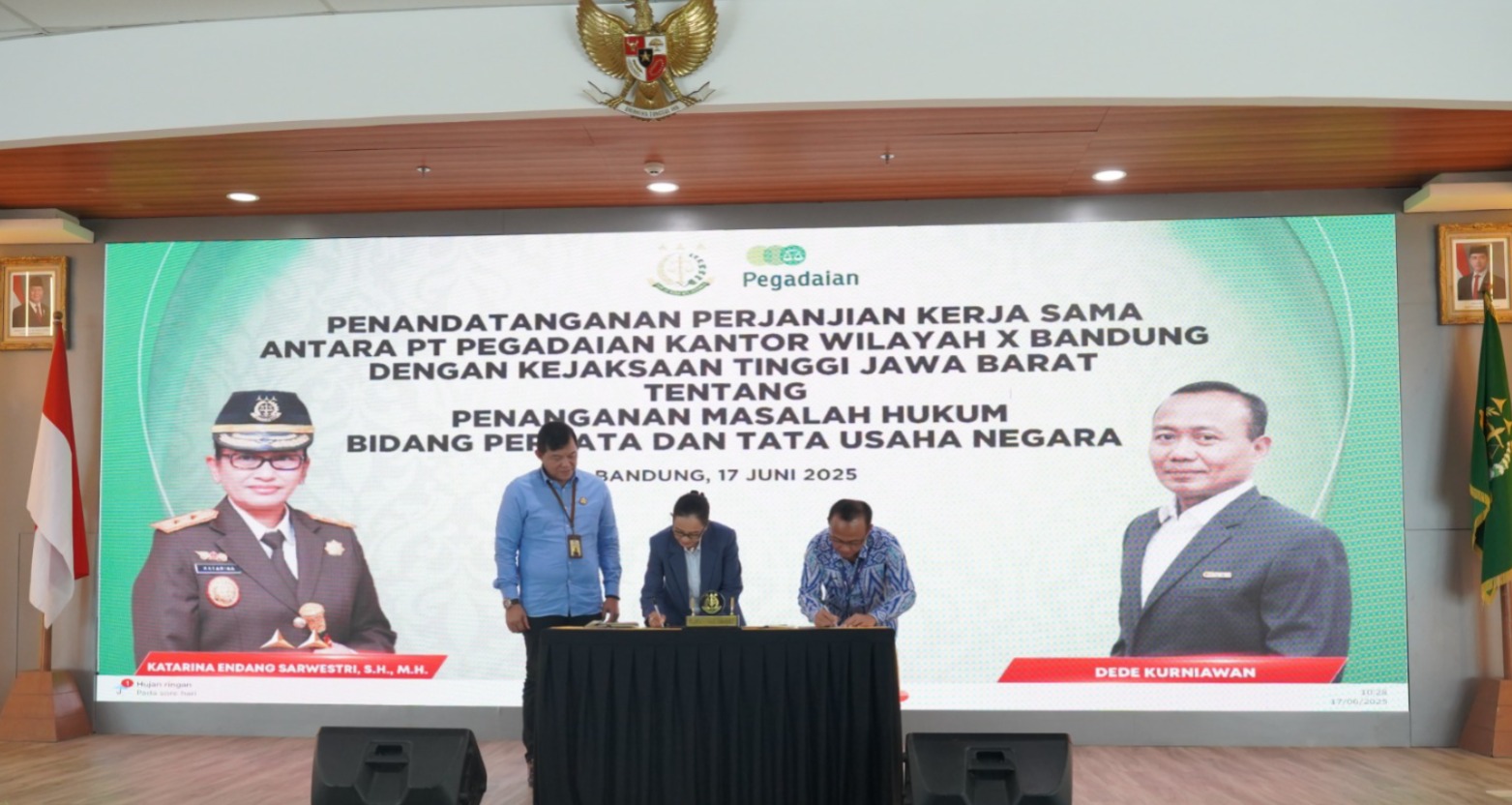 Jabar– Kepala Kejaksaan Tinggi Jawa Barat Katarina Endang Sarwestri, S.H., M.H. didampingi Asisten Perdata dan Tata Usaha Negara Kejaksaan Tinggi Jawa Barat, Jasri Umar beserta jajaran menandatangani Perjanjian Kerja Sama dengan PT Pegadaian Kantor Wilayah X Bandung tentang Penanganan Permasalahan Hukum Bidang Perdata Dan Tata Usaha Negara bertempat di Ruangan R.Soeprapto Lt.8 Kejati Jabar (17/06/25).