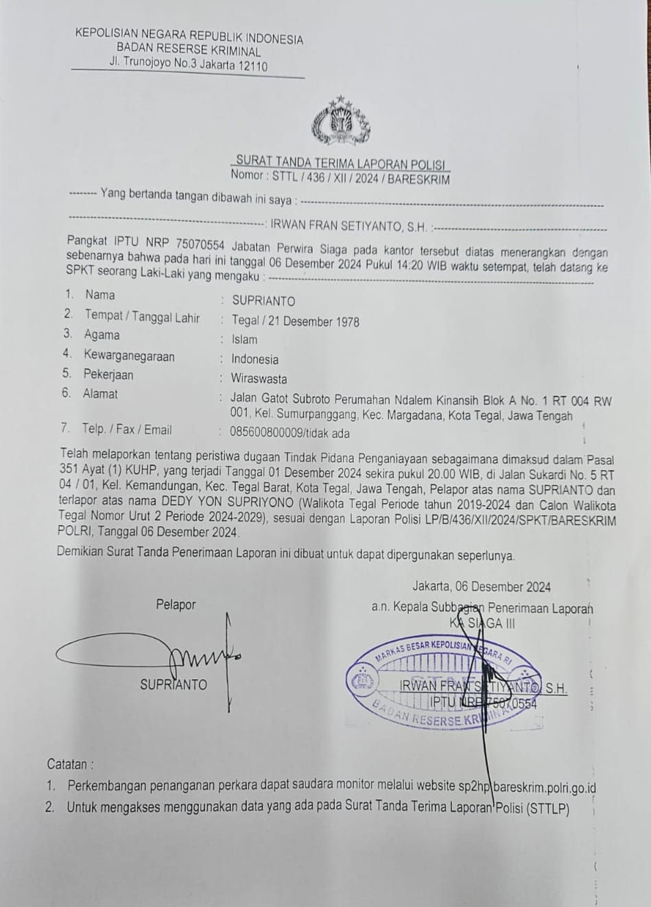 Tegal – Wali Kota Tegal terpilih pada Pilkada 2024 kemarin DYS dilaporkan ke Bareskrim atas dugaan tindak pidana penganiayaan oleh seorang warga Kota Tegal bernama Suprianto atau yang akrab disapa Jipri, pada Jumat 6 Desember 2024.