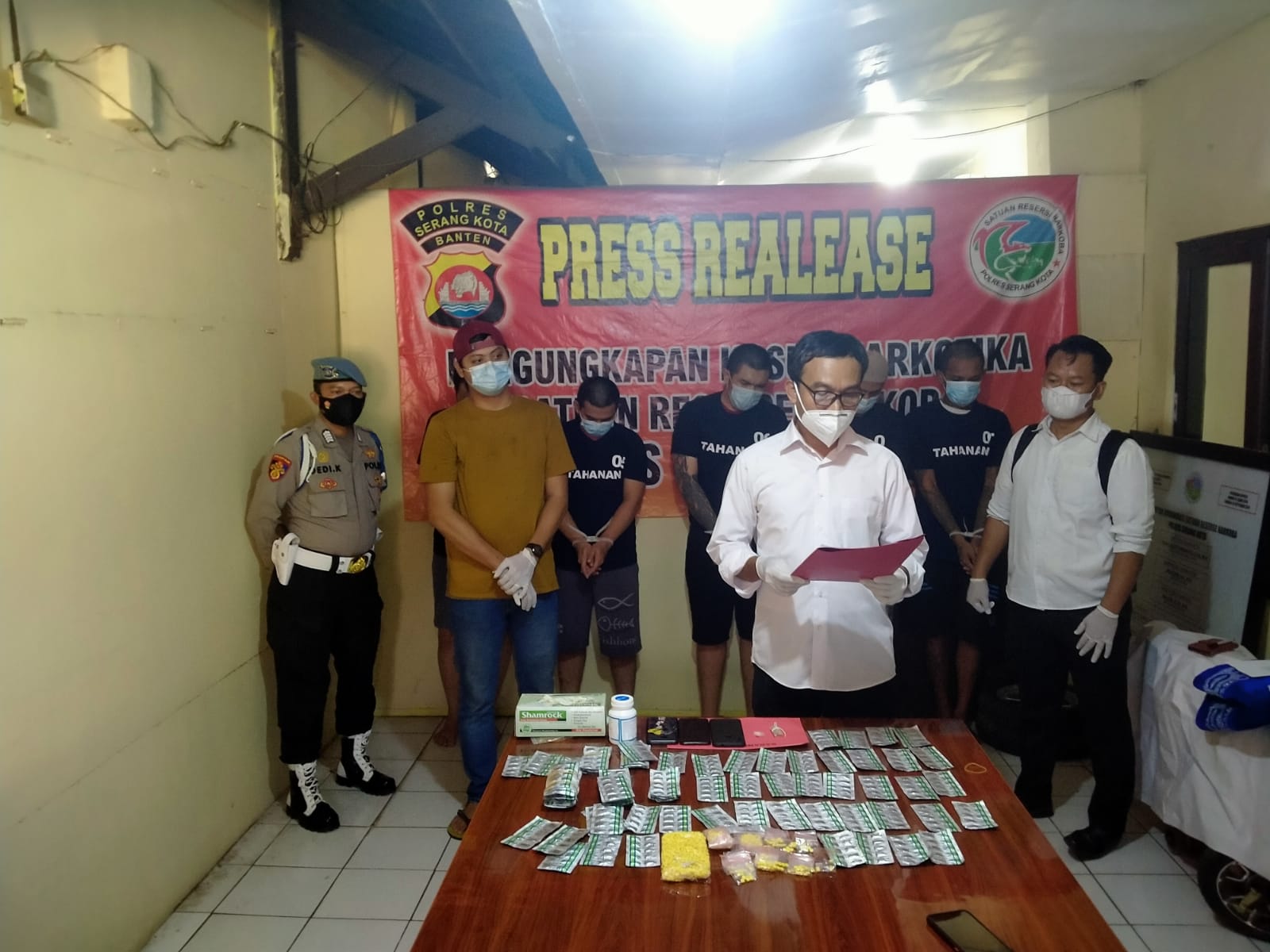 Kapolres Serang Kota AKBP Yunus Hadith Pranoto, S.IK., M.Si., melalui Kaur Binops Satresnarkoba Polres Serang Kota Iptu Makhrus Ngubaidah, SH, mengatakan, penangkapan ke lima pelaku ini berawal dari laporan warga bahwa ada tindak pidana penyalahgunaan narkotika jenis Sabu, Inex dan obat-obat keras yang masuk ke dalam daftar G.