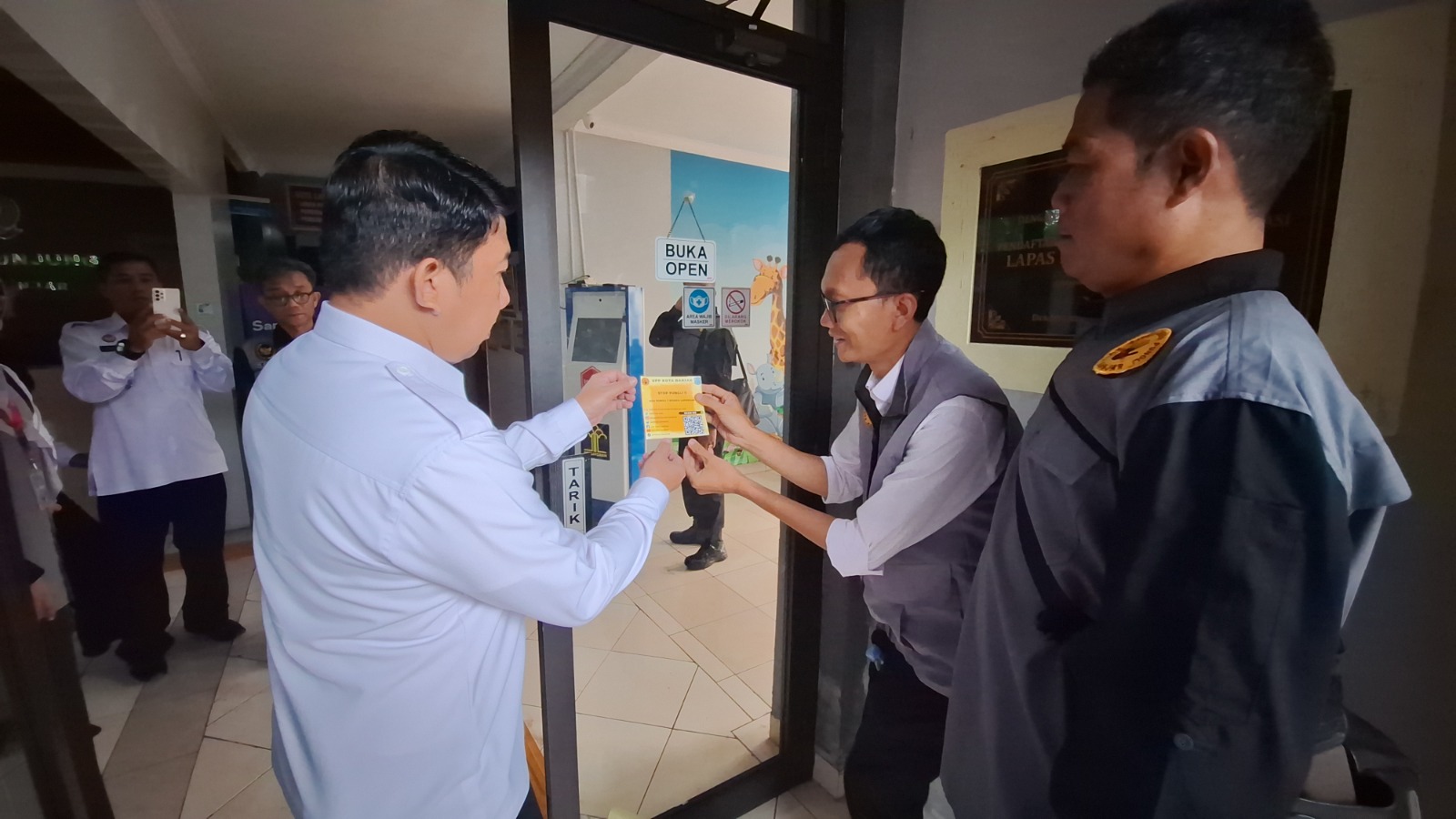 Lapas Banjar. Tim Satgas Saber Pungli Kota Banjar, Jawa Barat melaksanakan kegiatan sosialisasi dan pemasangan stiker pengaduan pungli pada pelayanan publik di Lapas Kelas IIB Banjar, Rabu (12/6).