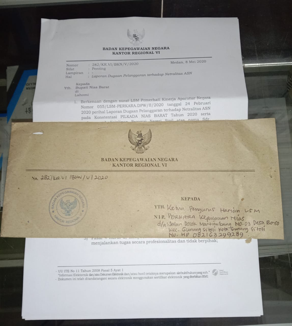 Berdasarkan surat BKN Regional VI nomor : 282/KR.VI/BKN/V/2020 Laporan dugaan Pelanggaran terhadap Netralitas ASN yang ditujukan langsung kepada bupati Nias Barat tepatnya tanggal 8 Mei tahun 2020 yang lalu,