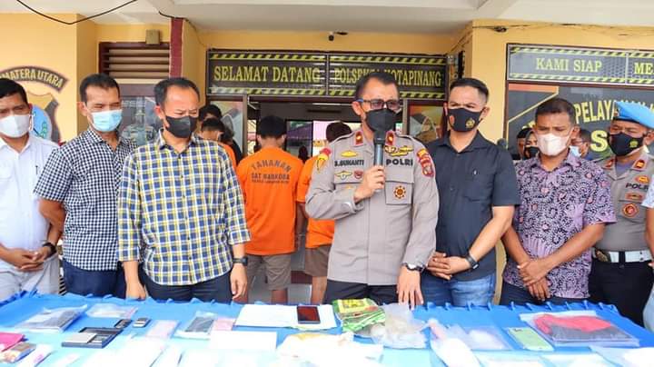 Baraknews Labuhanbatu –Kapolres Labuhanbatu AKBP ANHAR ARLIA RANGKUTI SIK melalui Kasat Narkoba Polres Labuhanbatu AKP MARTUALESI SITEPU, SH., MH bersama Kapolsek Kota Pinang KOMPOL BAMBANG G HTB, SH., MH pada hari Jumat tanggal 17 Juni 2022 sekira pukul 14.00 Wib menjelaskan terkait adanya pengungkapan kasus Narkotika jaringan Labuhanbatu Selatan.