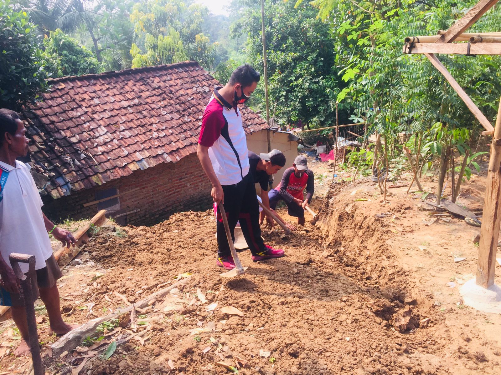 Berita Polres Lebak–. Bhabinkamtibmas Polsek Cibadak Polres Lebak Briptu Apriyanto bergotong royong bangun Jalan kampung bersama warga masyarakat Kp. nyomplong rt 01 rw 01 Ds. Cibadak Kec. Cibadak Kab. Lebak. Jum’at (3/9/2021)