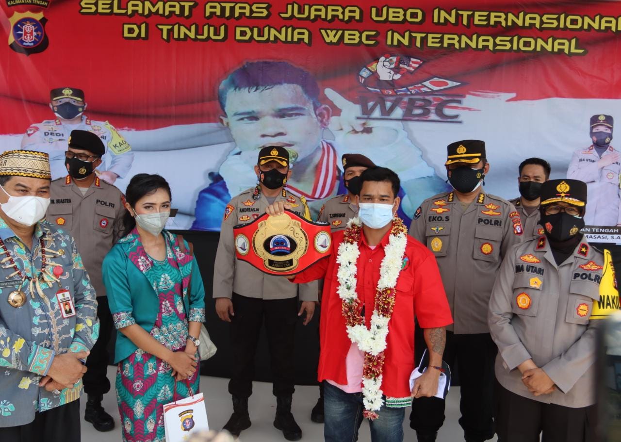 Diloby Mapolda Jalan Tjilik Riwut Km 1 Kota Palangka Raya, sang jawara WBC terlihat telah menerima piagam penghargaan dari Kapolda dan tali asih yang diserahkan Wakapolda Brigjen Pol. Ida Oetari Poernamasasi, S.A.P., M.A.