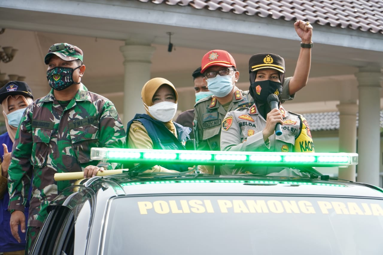 Berita Polres Banjar Polda Jabar – Kapolres Banjar AKBP Melda Yanny, S.I.K.,M.H. bersama Walikota Banjar Dr. Hj. Ade Uu Sukaesih, M.Si. kembali turun ke jalan dengan menggunakan kendaraan dinas bak terbuka, dan pengerah suara menyampaikan imbauan protokol kesehatan secara mobile.