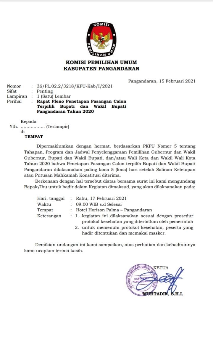 Ketua KPU Pangandaran Muhtadin dalam undangannya dikirim mencantumkan,”bahwa besok Rabu tanggal 17 Februari 2021 KPU akan mengelar sidang pleno penetapan pasangan terpilih Bupati dan wakil Bupati Pangandaran 2020