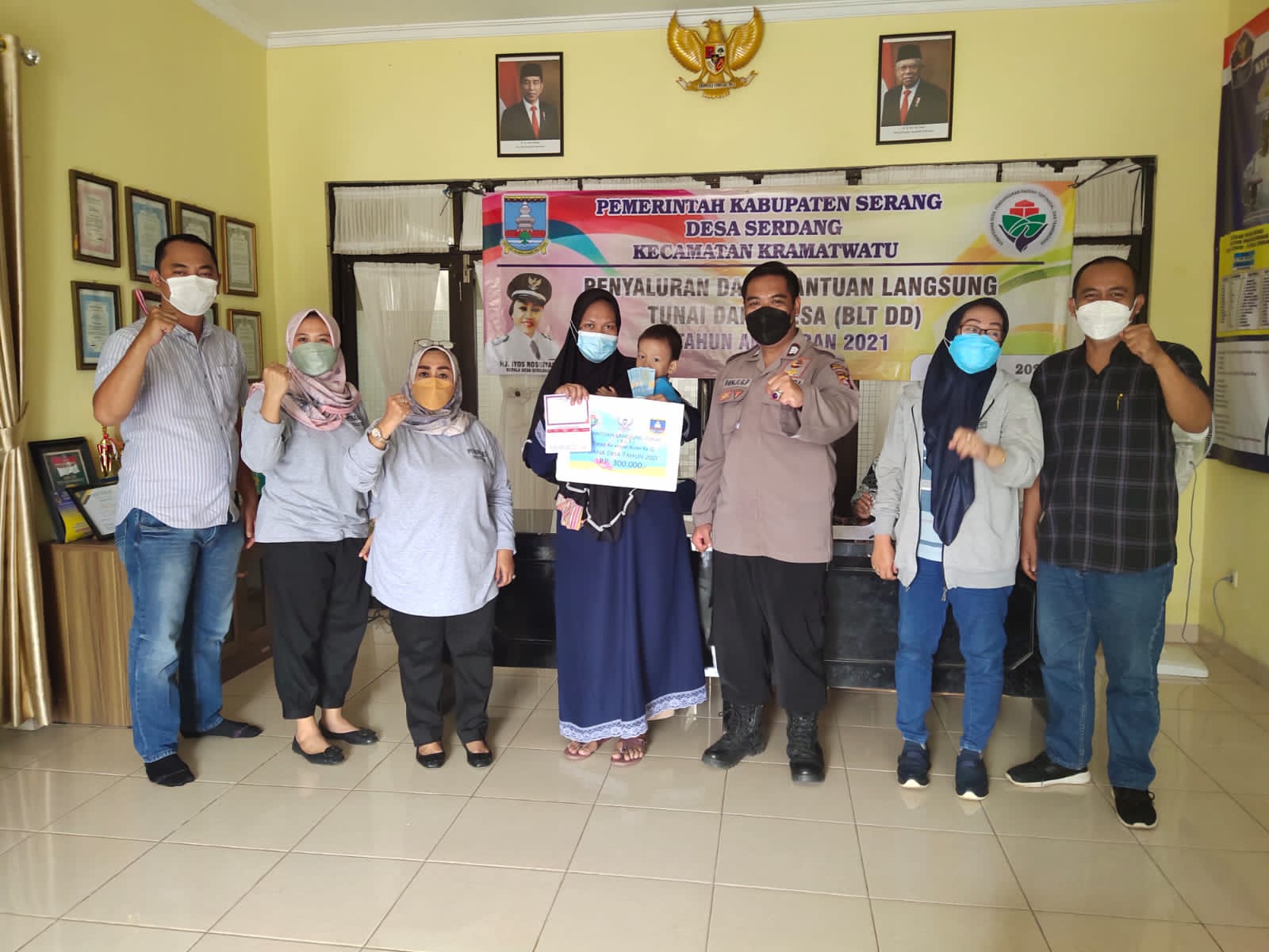 Terlihat Bhabinkamtibmas BRIGPOL Panji G.P. dan Kepala Desa Serdang Ibu Iyos serta perangkatnya menyerahkan bantuan tersebut kepada masyarakat yang terdaftar sebagai penerima BLT DD Desa Serdang. Sebanyak 50 Kepala Keluarga warga Desa Serdang yang menerima BLT Dana Desa sejumlah Rp.300,000,- (tiga ratus ribu rupiah).