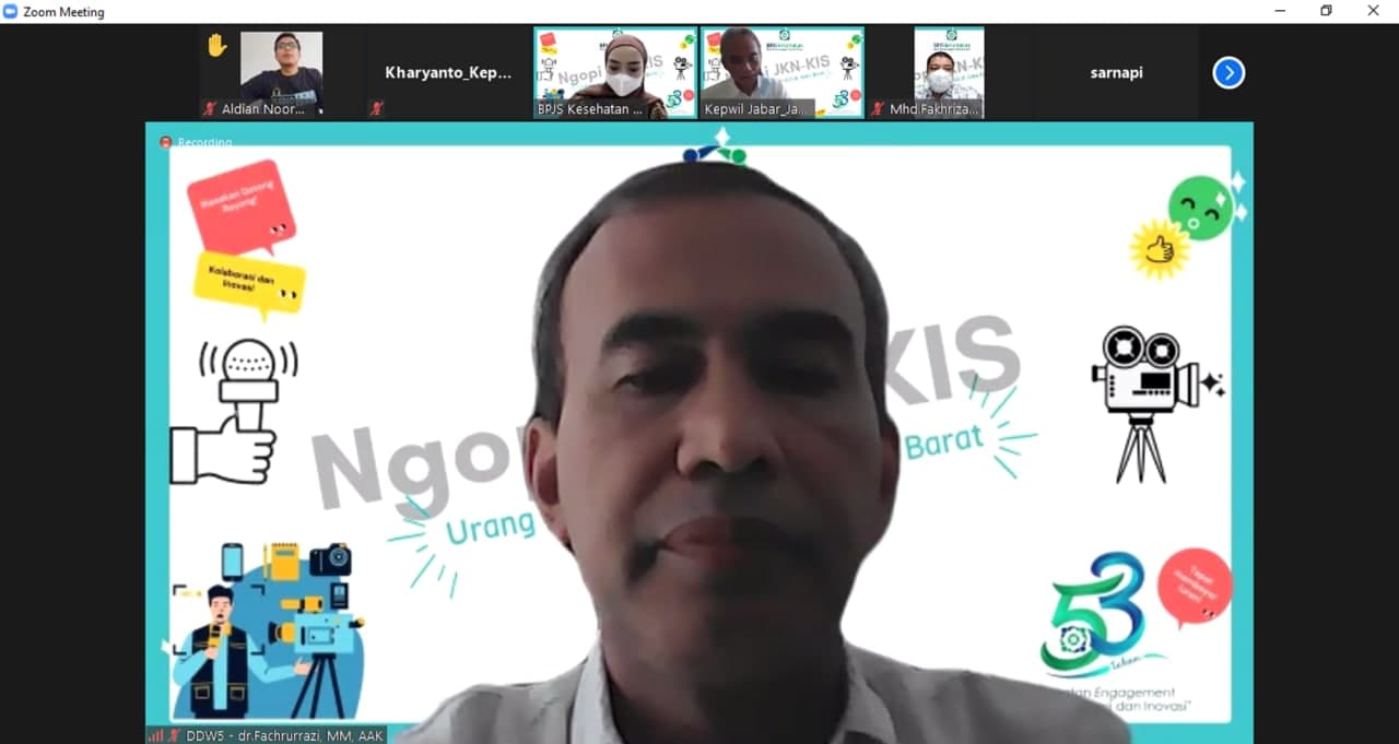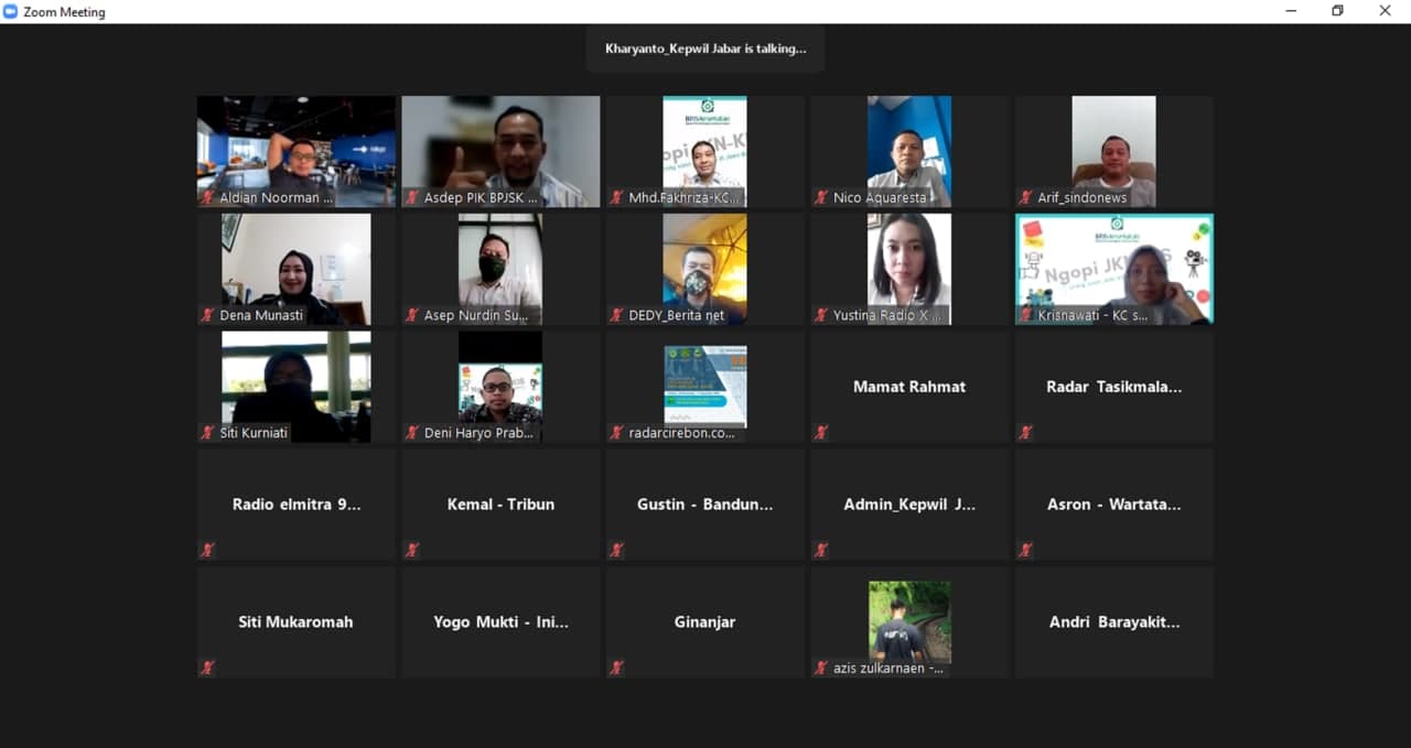 Berita BPJS Jawa Barat– Dalam rangka menjalin komunikasi dan koordinasi antara Badan Penyelenggara Jaminan Sosial Kesehatan dengan seluruh awak media masa di Kedeputian Wilayah Jawa Barat, BPJS Kesehatan menggelar Media Gathering yang dinamai “Ngopi JKN-KIS” secara daring. Kegiatan Ngopi JKN-KIS ini dihadiri oleh Deputi Direksi Wilayah Jawa Barat BPJS Kesehatan Fachurrazi, jajaran Kepala Cabang BPJS Kesehatan se Kedeputian Wilayah Jawa Barat, dan perwakilan media cetak dan elektronik se Kedeputian Wilayah Jawa Barat pada Rabu (28/07).