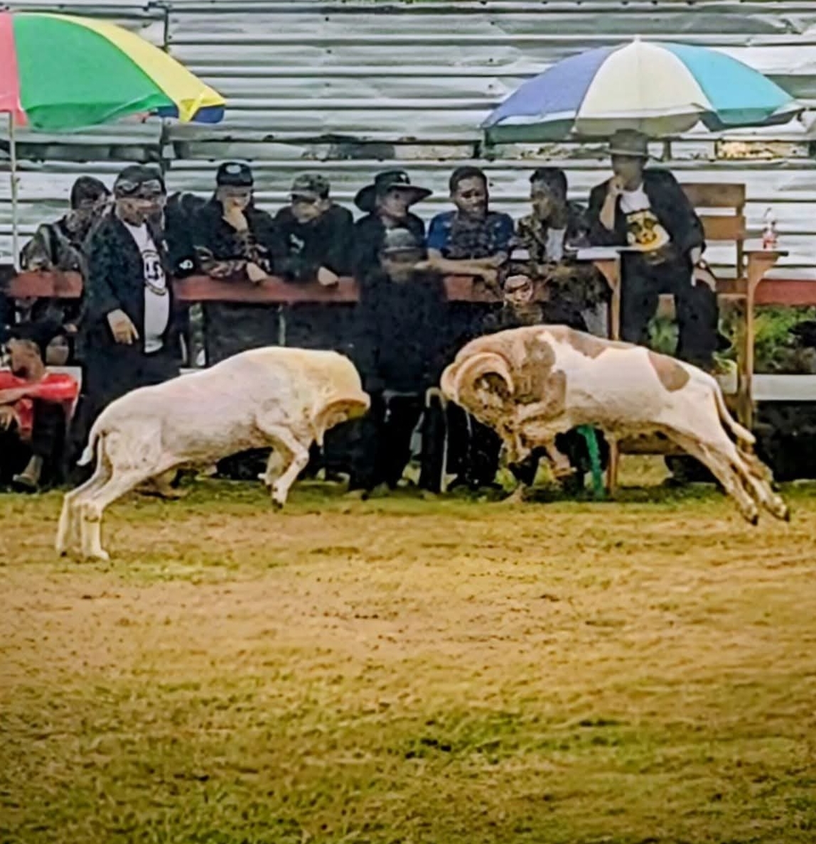 Dua ekor domba Garut tampak saling berhadapan di arena, mempertontonkan ketangkasan, kekuatan, dan teknik khas yang menjadi ciri utama seni adu domba Garut. Sorak sorai penonton mengiringi setiap gerakan, menciptakan suasana meriah dan penuh antusiasme.