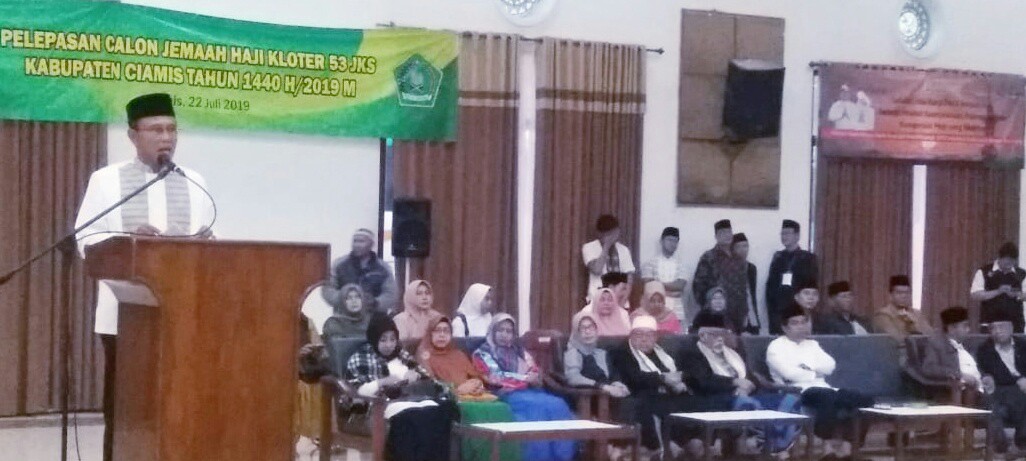 BERITA CIAMIS – Ciamis (22/7) Pkl 05.30 s.d 07.00 WIB bertempat di gedung Islamic Center Ciamis dilaksanakan pemberangkatan jemaah calon haji asal Kabupaten Ciamis Kloter 53 JKS sebanyak 306 jemaah dan 6 petugas. Pemberangkatan dihadiri oleh Bupati Ciamis Dr. H. Herdiat Sunarya, Wakil Bupati Ciamis Yana D Putra, Anggota DPRD Teten Masduki, Asda 2 Drs. H. Wasdi Ijudin, Kepala Kemenag Drs. KH. Agus Abdul Kholik, Ketua MUI Drs. KH. Ahmad Hidayat, Ketua Baznas Drs. KH. Aep Saeful Uyun, pengurus KBIH dan PPIH, Jemaah Calon Haji beserta keluarga pengantar.