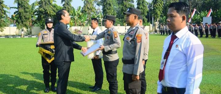 Baraknews OKUS, Muaradua – Bupati OKU Selatan Popo Ali, M.B., Com., Berikan penghargaan kepada Personel Polres OKU Selatan yang berprestasi di bidang pelaksanaan tugas di bagian SDM, Logistik, bidang Inovasi Pelayanan Publik, Anggaran dan di bidang Pemberantasan Narkotika.di Lapangan Mapolres OKU Selatan, Senin (7/8).