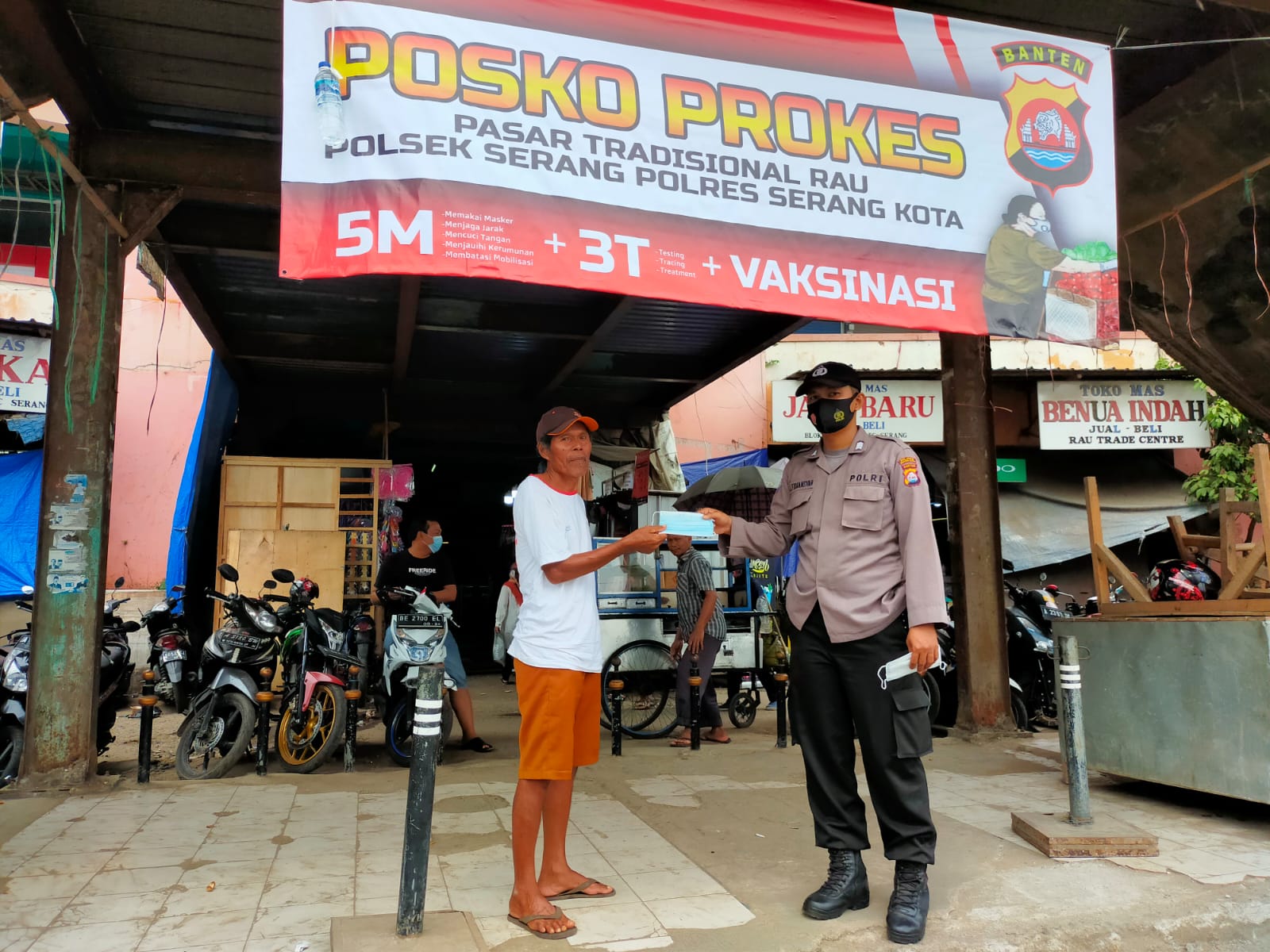 Bripka Ari Fidiansya melaksanakan Pembagian Masker di Pasar Rau Kota Serang. Sabtu (21/8/2021).