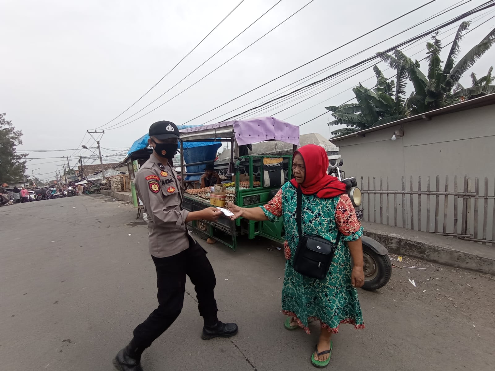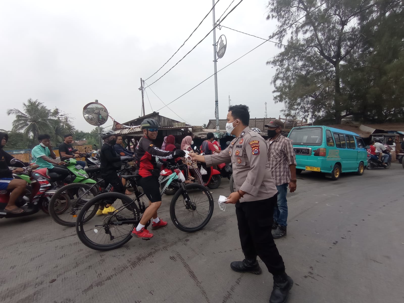 Tampak petugas dari Polsek Kasemen membagikan masker kepada masyarakat.