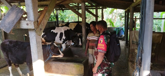 Baraknews kodim Blitar – Sebagai upaya untuk mencegah terjadinya penyebaran Penyakit Mulut dan Kuku (PMK) di wilayah, Babinsa Koramil Tipe B 0808/13 Doko Kodim 0808/Blitar, Koptu Dwi Aprianto dengan penuh semangat melaksanakan kegiatan pemantauan dan pengecekan hewan ternak milik warga binaannya, di Desa Suru Kec. Doko Kab. Blitar, Rabu (28/9/2022).