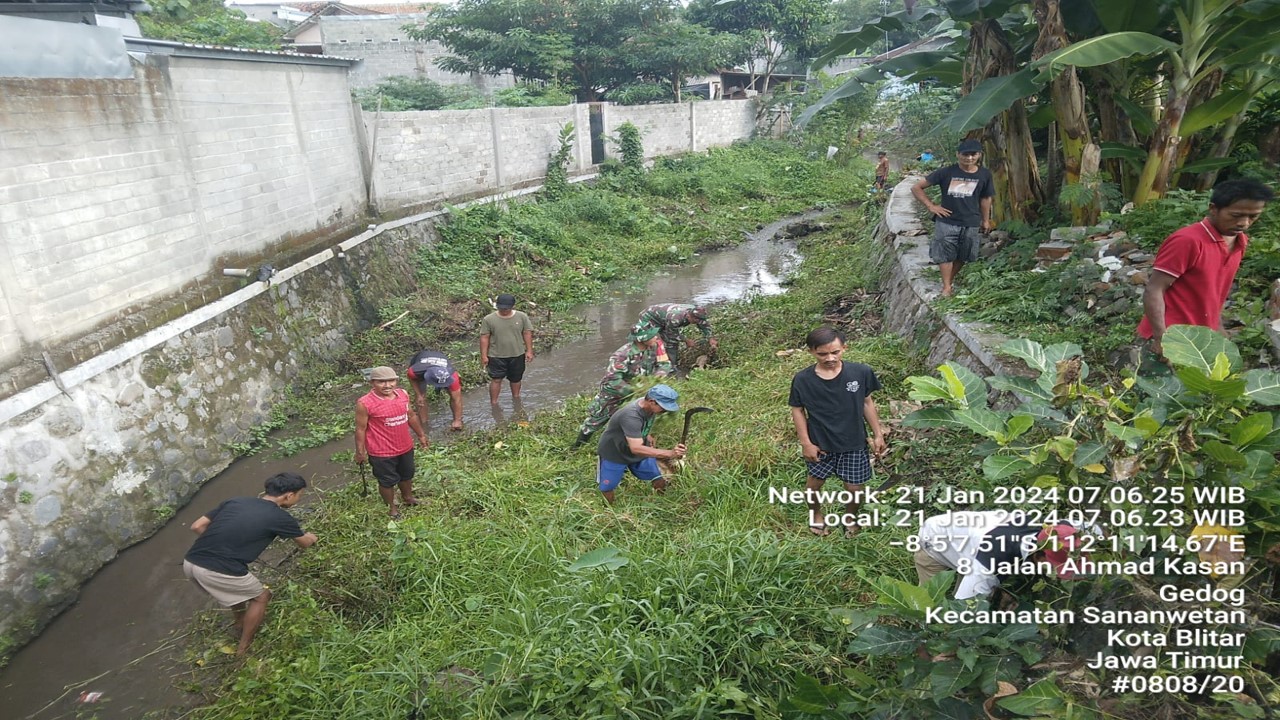 Kodim Blitar – Dalam upaya mencegah terjadinya banjir, anggota Koramil 0808/20 Sananwetan Kodim 0808/Blitar bersama tiga pilar dan warga masyarakat, melaksanakan kegiatan pembersihan aliran sungai. Kegiatan ini, dilaksanakan di Jalan Karya RW. 10 Kelurahan Gedog Kecamatan Sananwetan Kota Blitar, Minggu (21/1/2024).