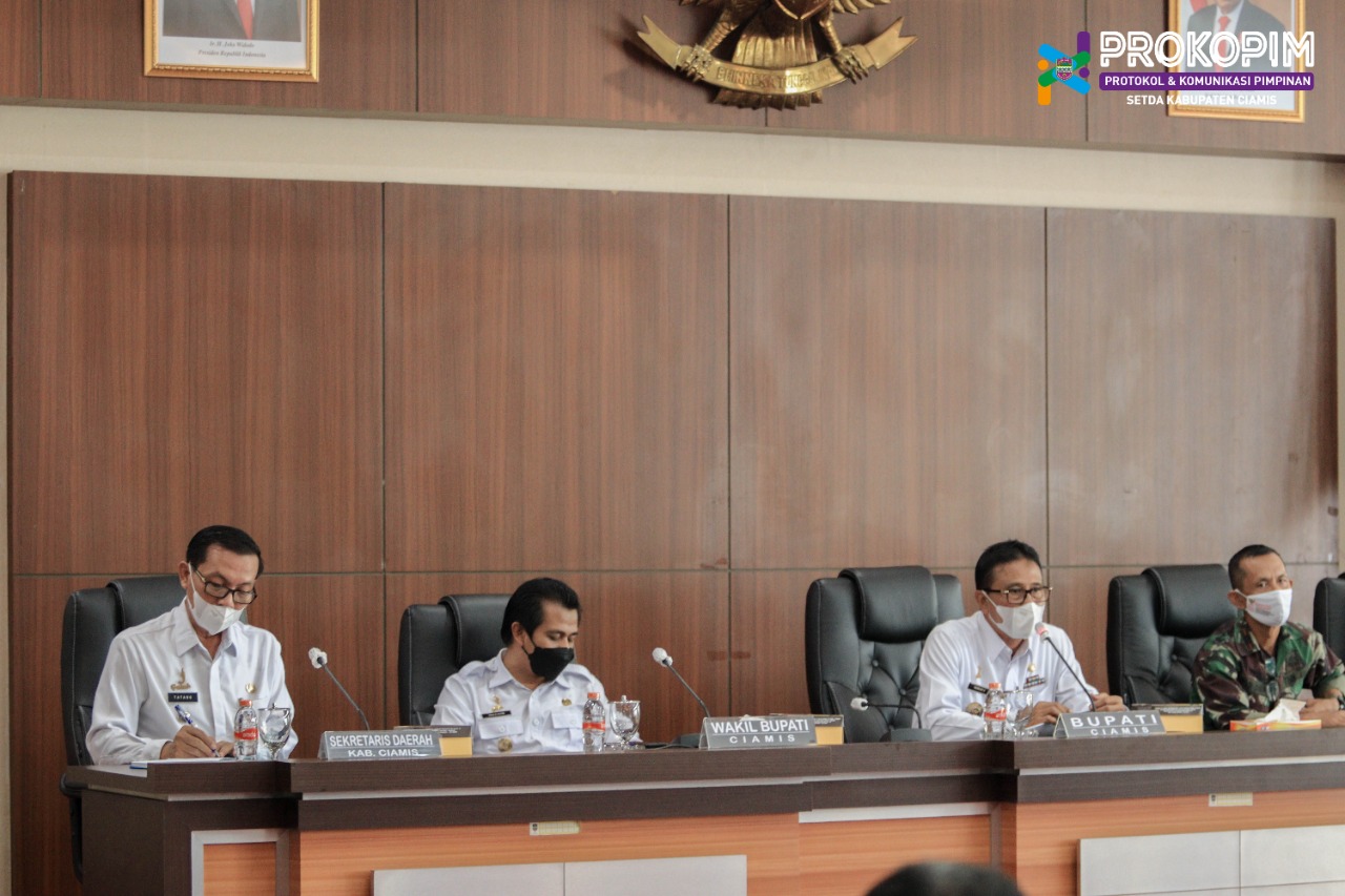 Menyikapi hal itu, Bupati Ciamis Herdiat Sunarya menggelar rapat koordinasi bersama satuan gugus tugas Covid-19 Kabupaten Ciamis di Aula Sekretariat Daerah Ciamis. Rabu (09/06/2021).