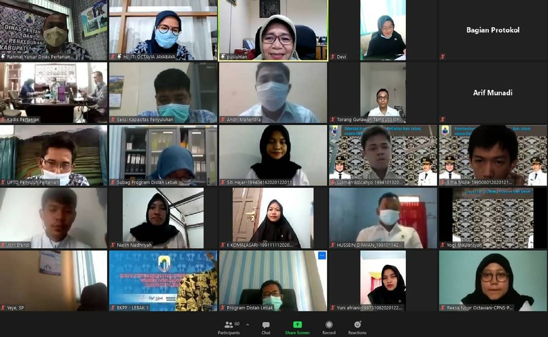 Berita Kab.Lebak-, Sebanyak 24 Calon Pegawai Negeri Sipil Daerah (CPNSD) Penyuluh Pertanian di Kabupaten Lebak mengikuti Pelatihan Orientasi secara virtual melalui platform zoom meeting yang diselenggarakan oleh Dinas Pertanian Kabupaten Lebak. Kegiatan secara resmi dibuka oleh Bupati Lebak Iti Octavia Jayabaya, Kamis (04/03/2021).