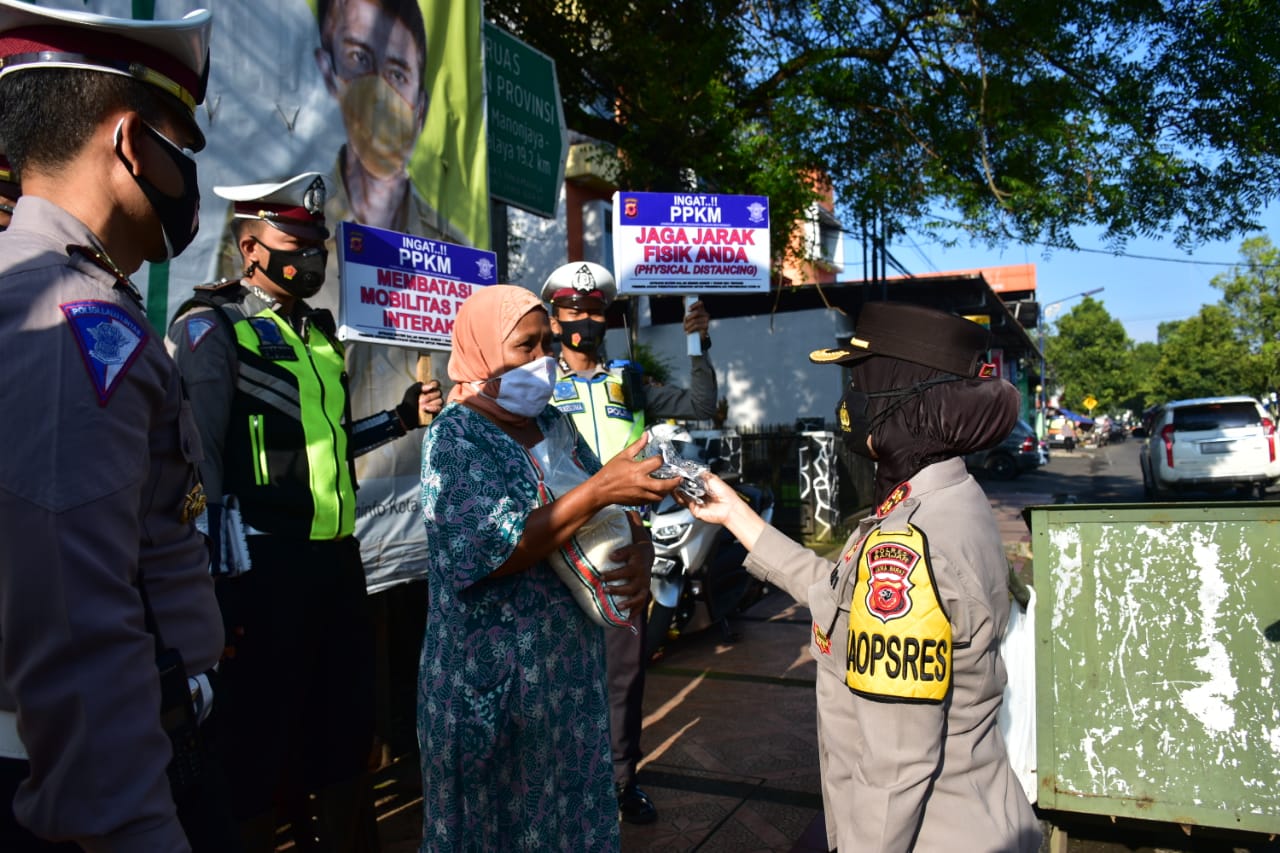 Dalam kegiatan tersebut juga Kapolres Banjar memberikan bantuan berupa sembako dan masker kepada warga masyarakat yang kurang mampu yang ditemui di sekitaran Alun-alun Kota Banjar.