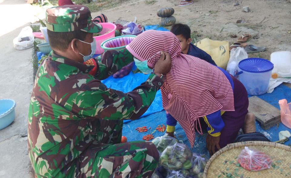 Berita Kab.Muna, – Demi memutus Penyebaran Covid-19 dan pendisiplinan protokol kesehatan kepada masyarakat wilayah binaan, Babinsa Koramil 1416-07/Tampo Sertu Lini. L bersama petugas kesehatan dari Puskesmas Towea melaksanakan patroli Prokes (Protokol Kesehatan) yang disasar adalah warga yang tidak memakai masker bertempat di pasar tradisional desa Lakarama Kec. Towea Kab. Muna,(21/2/2021).