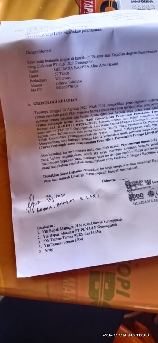 Berita Gunungsitoli,Sumut— Dalam minggu ini Beredar rumor dimedia terkait Surat PT.PLN.ULP Gunungsitoli yang diduga menuduh Gelisana Harefa telah melakukan pelangaran dalam pemakaian jaringan tenaga listrik membuat dirinya melapor ke polres nias semalam (30/9). Ketua Serikat PERS Mandiri atau disingkat SPM berharap polres nias Menindaklanjuti. Kamis 01/10/2020.