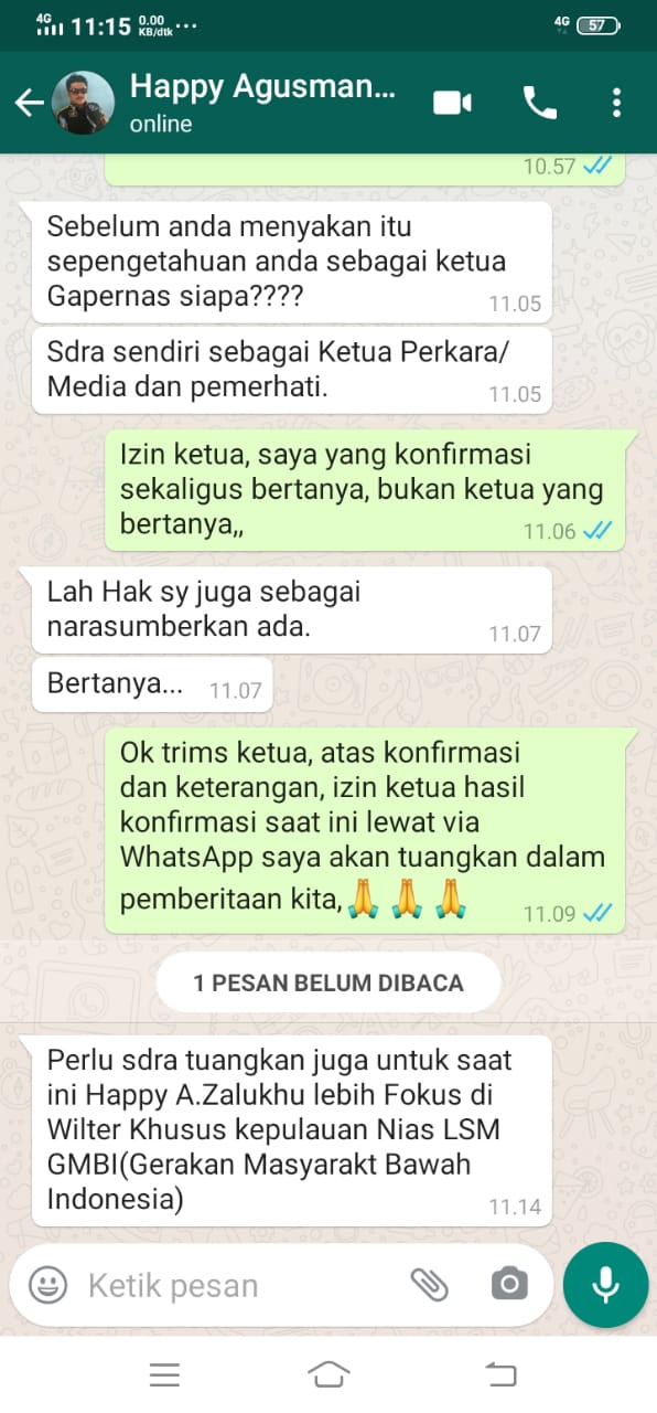 Hal ini disampaikan Happy Agusman Zalukhu yang dikenal sebagai ketua GAPERNAS saat dikonfirmasi lewat via Whatsapp dan komentarnya di akun Facebook saat membalas komentar,,,, disalah satu statusnya.