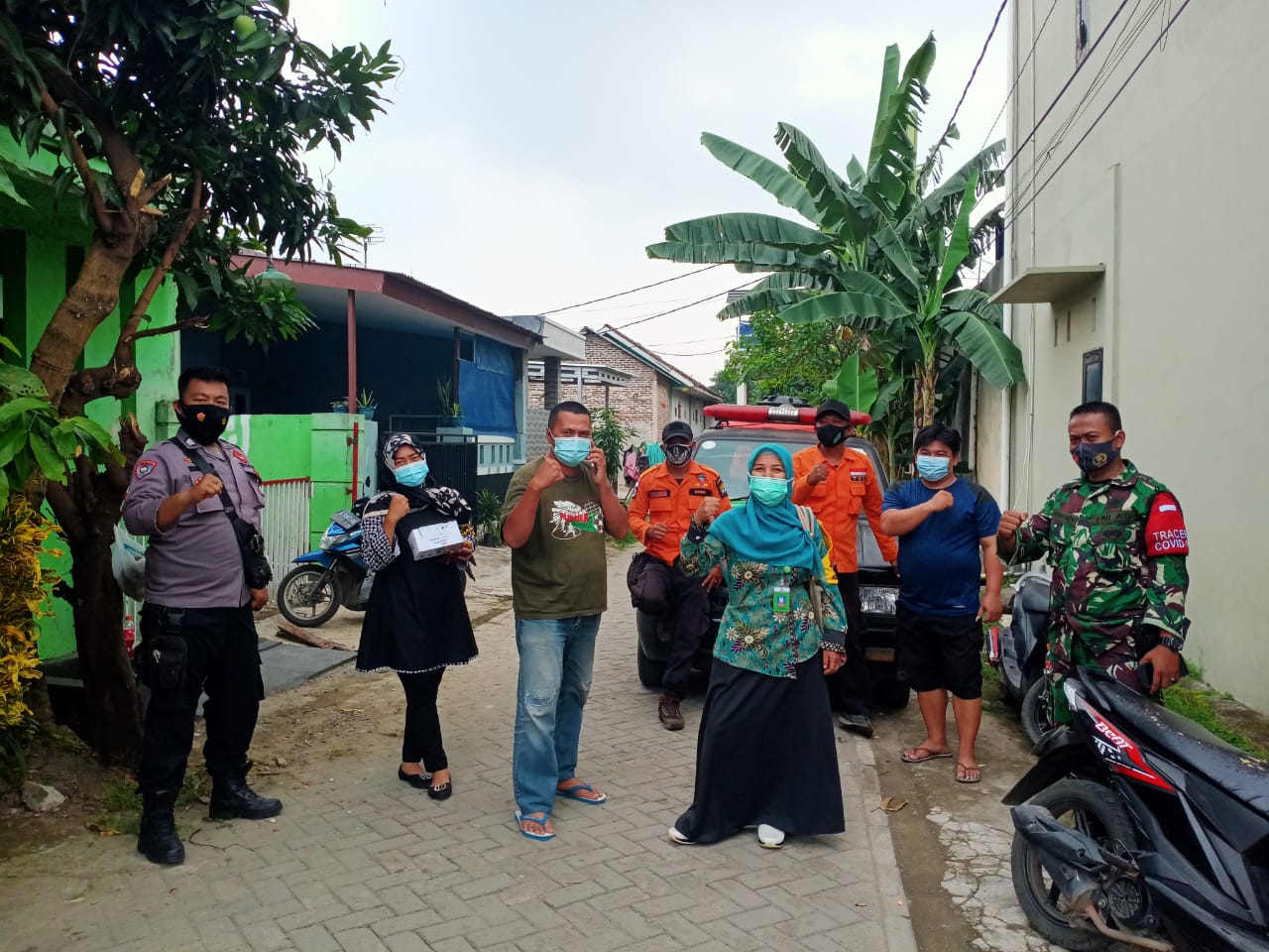 Bhakti sosial kali ini, petugas malakukan penyemprotan disinfektan dan pembagian masker.