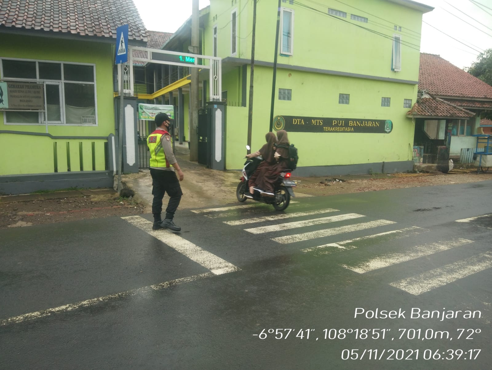 Berita Polres Majalengka, Meskipun hujan gerimis anggota Polsek Banjaran Polres Majalengka Polda Jabar tetap melaksanakan pemantauan dan pengaturan arus lalu lintas di depan sekolah MTS Banjaran dan SMPN 1 Banjaran sebagai bentuk pelayanan prima pagi hari, Jumat (5/11/2021).