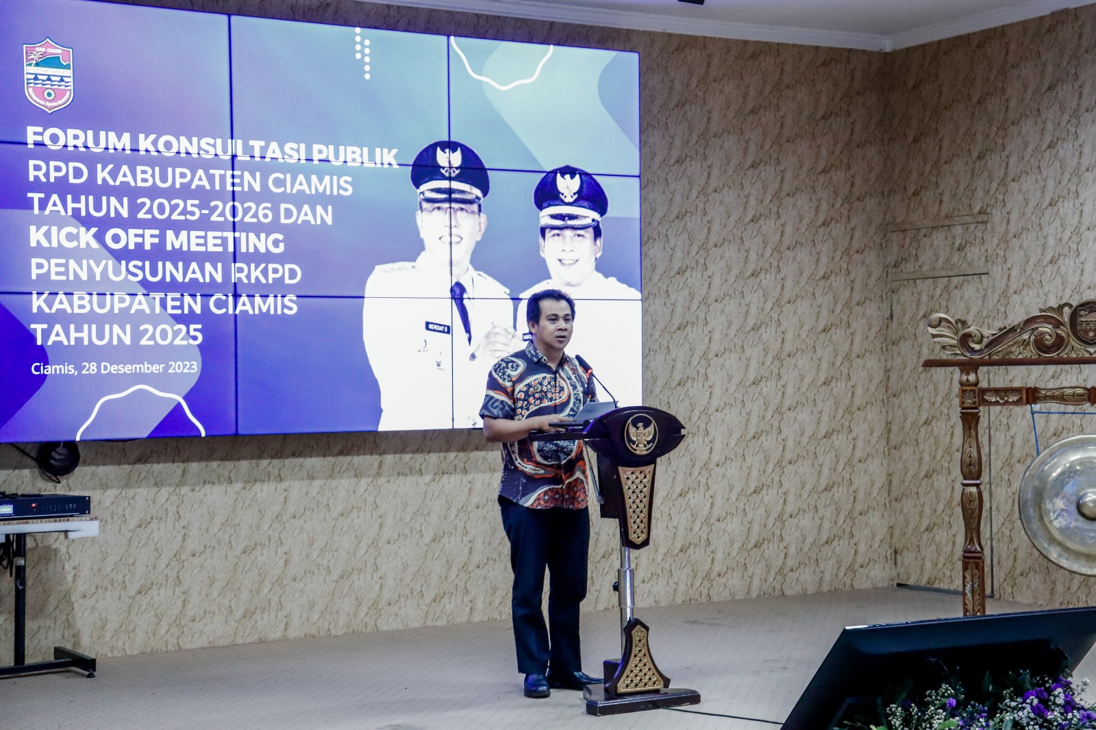 KABUPATEN CIAMIS — Wakil Bupati Ciamis membuka Secara resmi Forum Konsultasi Publik Rencana Pembangunan Daerah (RPD) Kabupaten Ciamis Tahun 2025 – 2026 dan Kick Off Meeting Penyusunan Rencana Kerja Pembangunan Daerah (RKPD) Kabupaten Ciamis Tahun 2025, pada (28/12/2023) siang, bertempat di Aula BAPPEDA Kabupaten Ciamis.