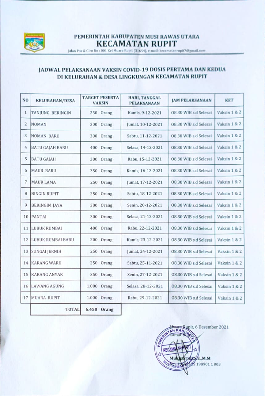 Bagi warga yang berdomisili di desa-desa Kecamatan Rupit Kabupaten Muratara dan sekitarnya yang belum mendapatkan vaksin dosis satu dan dosis dua, berikut informasi mengenai waktu vaksinasi Covid-19 gratis di desa desa kecamatan Rupit.