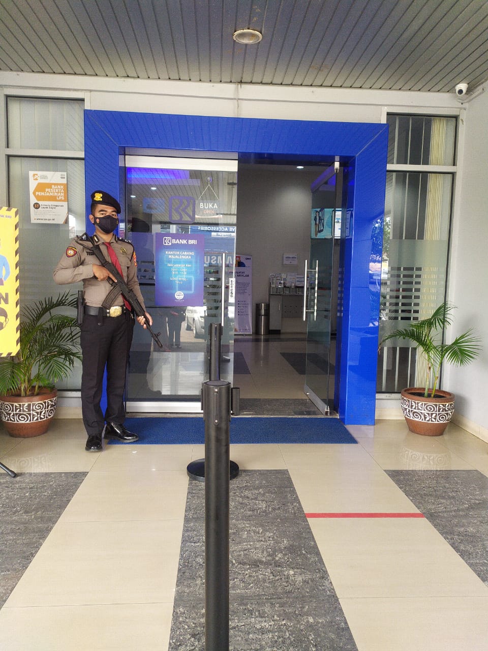 Sat Samapta Polres Majalengka Perketat pengamanan dalam melaksanakan penjagaan obyek vital adalah salah satu cara dalam mencegah segala bentuk tindak kejahatan serta memberikan rasa aman dan nyaman kepada nasabah yang sedang melaksanakan aktivitas perbankan” ucap Bripda Dani Kamaludin yang merupakan Personil Sat Samapta Polres Majalengka selaku petugas jaga di Bank.