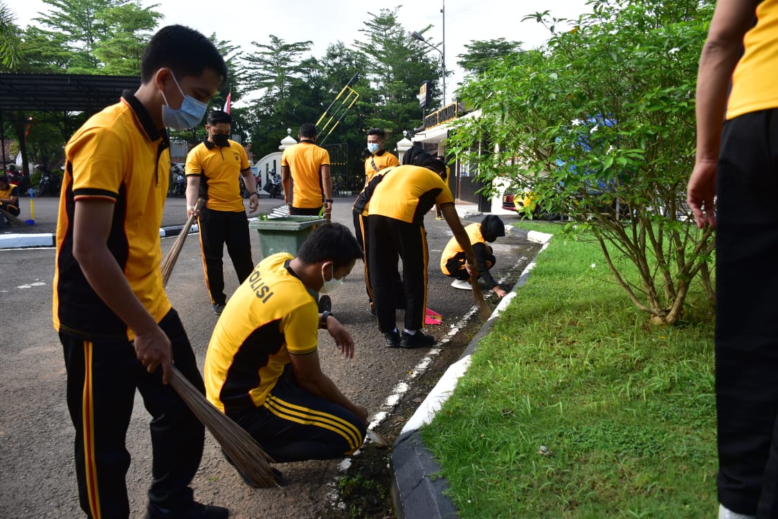 Setidaknya 230 anggota pagi ini serentak melaksanakan korvey untuk membersihkan halaman Mapolres, Taman-taman sekitar dan khususnya dalam ruangan dimana tempat bekerja sehari-hari