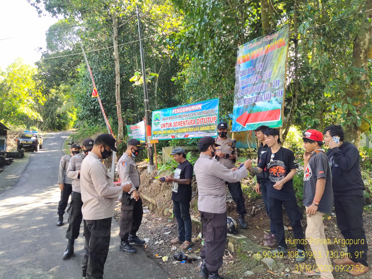 Beeita Mapolres Majalengka, –Jelang Pergantian Tahun Baru 2021, Kapolsek Argapura IPTU Sarjiyo Pimpin Langsung Patroli Pada Obyek Wisata Lawang Sketeng Desa Sukasari Kaler Kecamatan Argapura Berikan Himbauan Kamtibmas Pada Pengunjung Obyek wisata, Kamis (31/12/2020).