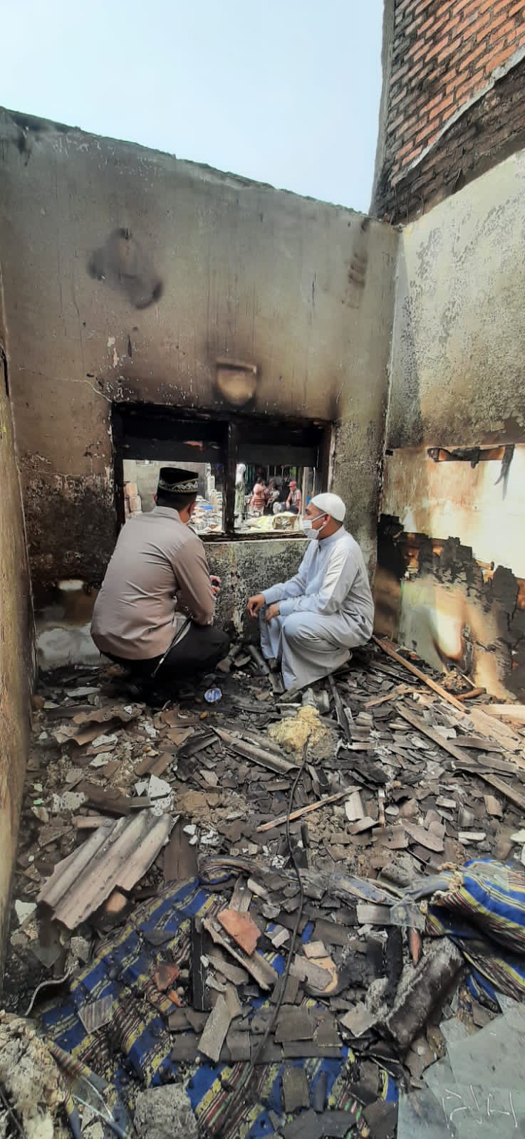 Kapolres Karawang Polda Jabar melakukan pengecekan lokasi yang terbakar dengan melihat langsung puing puing bangunan yang dilalap s jago merah, dalam kesempatan tersebut Kapolres menyapa santri yatim serta warga sekitar.