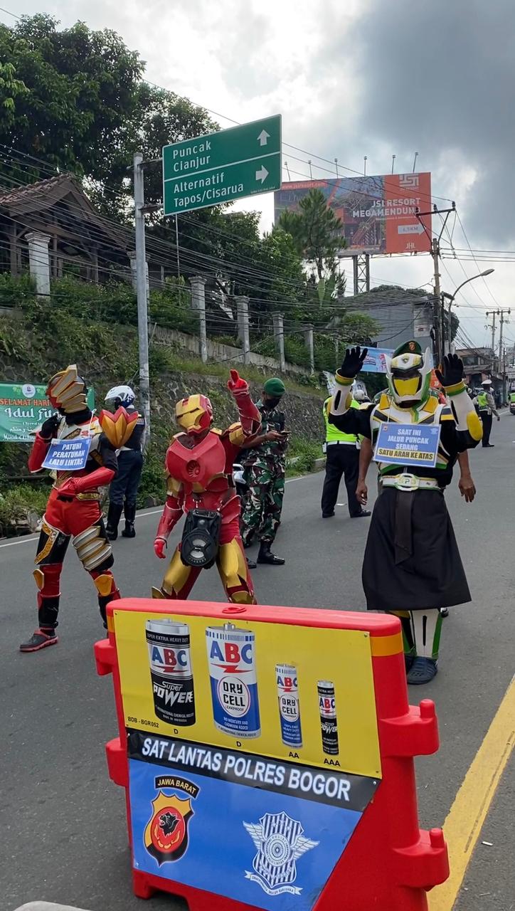 Baraknews Polda Jabar–Hibur pengendara yang menunggu proses di berlakukannya one way, Satlantas Polres Bogor Polda Jabar  turunkan sejumlah badut untuk menghibur warga di Jalur Puncak Bogor, Sabtu (7/5/2022).