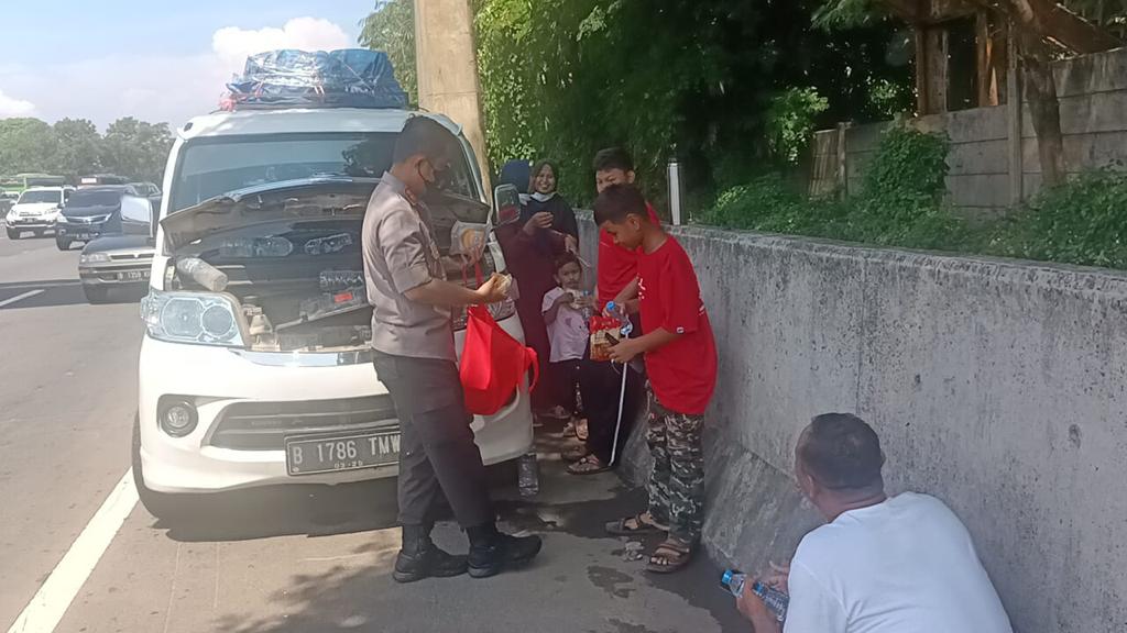 Saat tengah melakukan pantauan arus dengan berpatroli diruas tol dan menemui satu keluarga yang tengah istirahat guna mendinginkan kendaraan usai perjalanan mudik dari jawa tengah, Kapolres dengan sigap menghampiri sambil memberikan makanan dan minuman kepada pemudik tersebut.