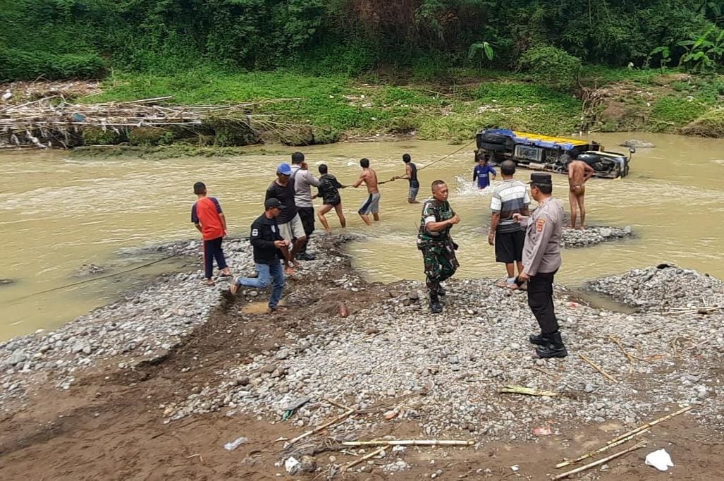 Kabid Humas Polda Jabar : Polisi, TNI Bersama Warga Evakuasi Kendaraan Dump Truk Yang Terseret Arus Sungai Cijurey