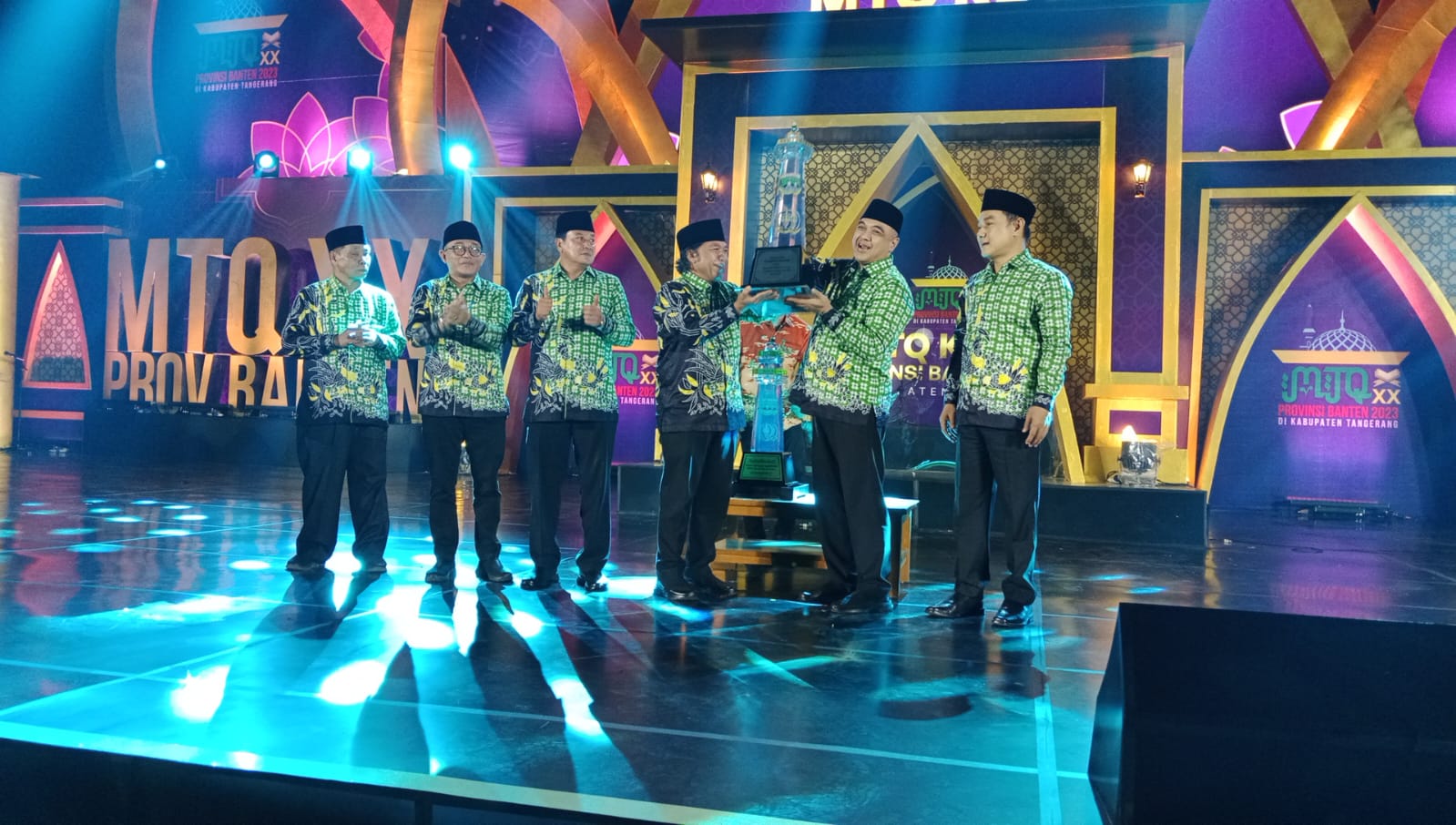 Secara langsung, Pj Gubernur Banten, Al-Muktabar menyerahkan piala bergilir kepada Bupati Tangerang, Ahmed Zaki Iskandar pada penutupan MTQ XX tingkat Provinsi Banten yang diselenggarakan di Alun-alun Tigaraksa Kabupaten Tangerang pada Sabtu (29/07/2023) malam.
